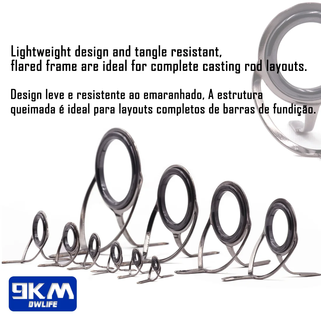 Las puntas de las guías de las cañas de pescar están hechas de un marco de acero inoxidable con un anillo de cerámica, los ojales de 10 tamaños se adaptan a los distintos tipos de cañas de pescar propiedad de pescadores profesionales.