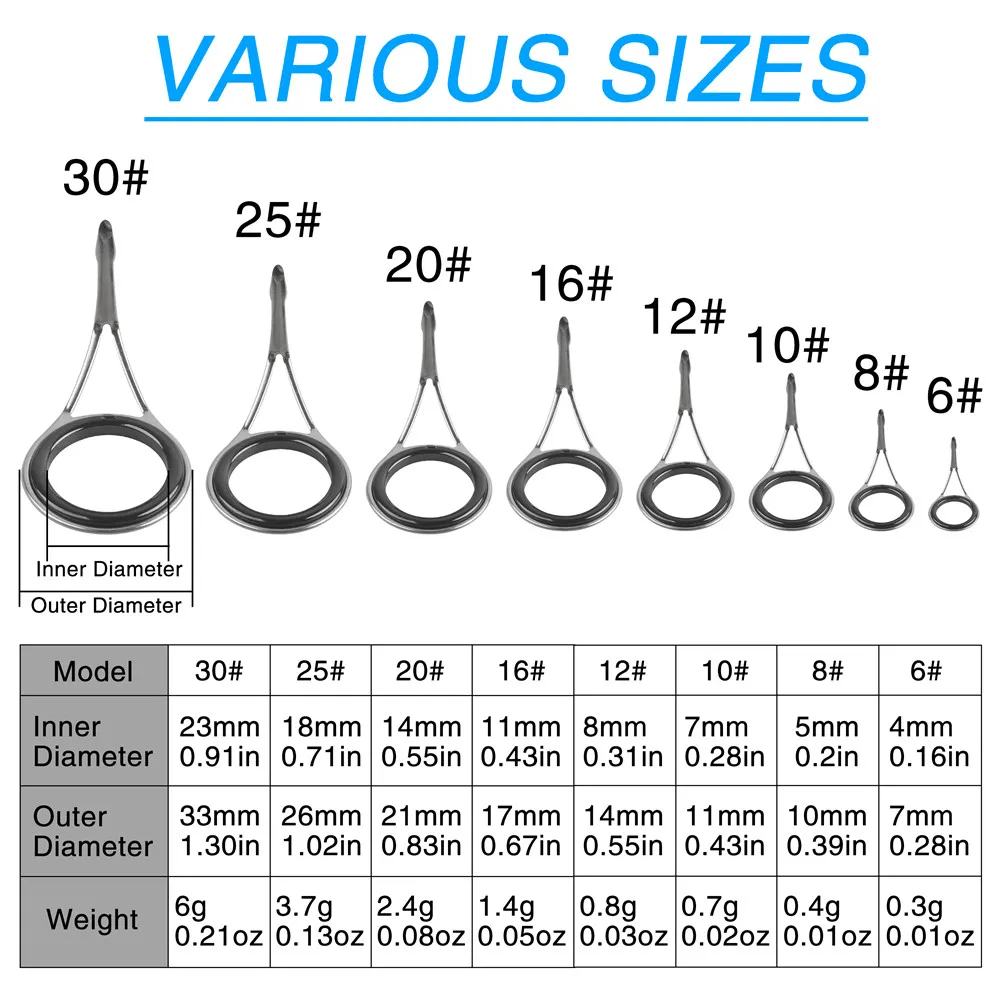 3.Guías de caña de 8 tamaños mixtos, accesorios esenciales de pesca con caña de mar DIY al aire libre.