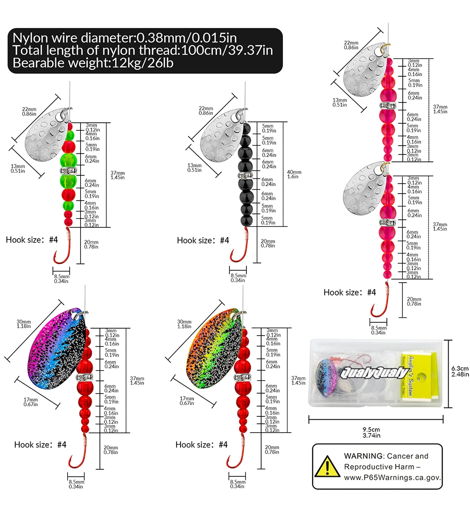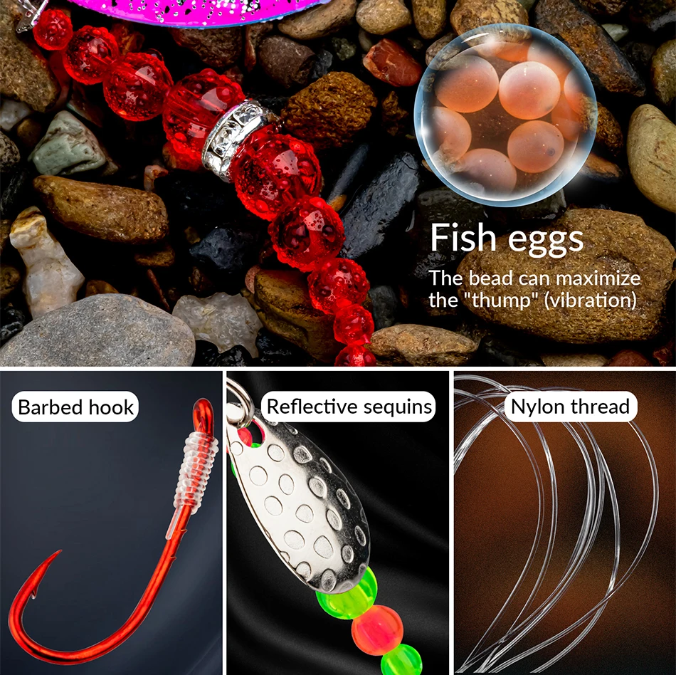1.Materiales de primera calidad: cada spinnerbait viene con un anzuelo triple afilado, un cuerpo principal chapado y un eje de acero inoxidable.Con mangas atractores de golpes de colores brillantes, estos señuelos de pesca pueden proporcionar destellos y vibraciones continuos, lo que ayuda a atraer más peces.