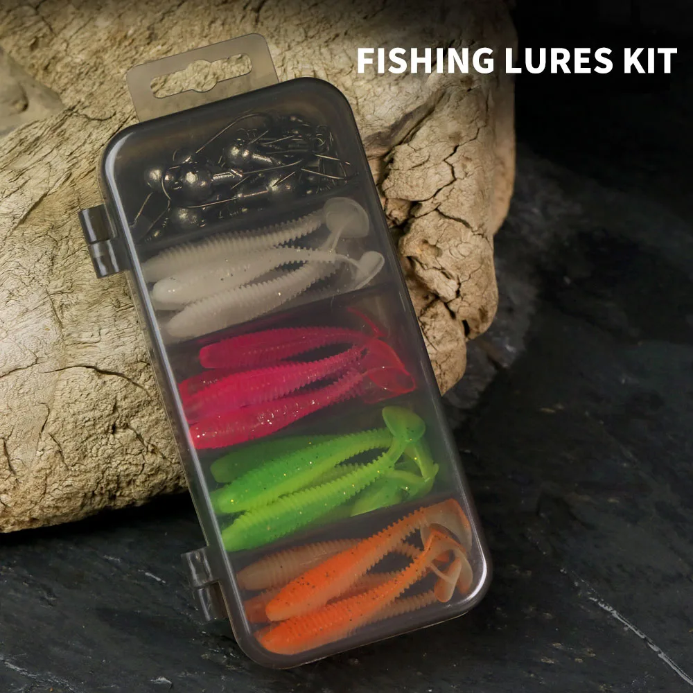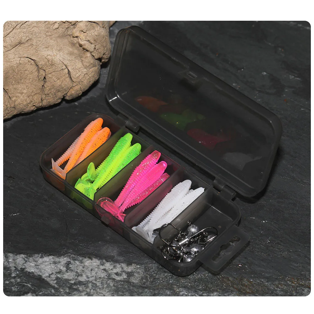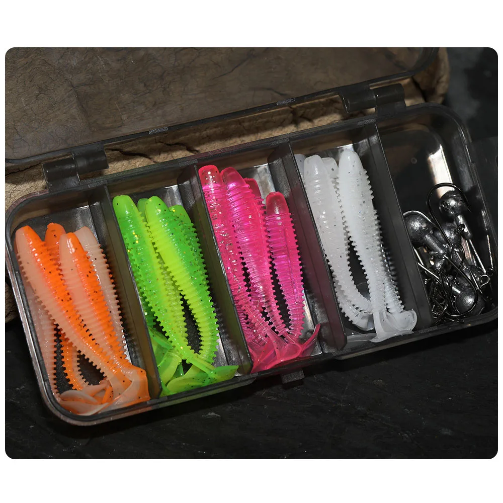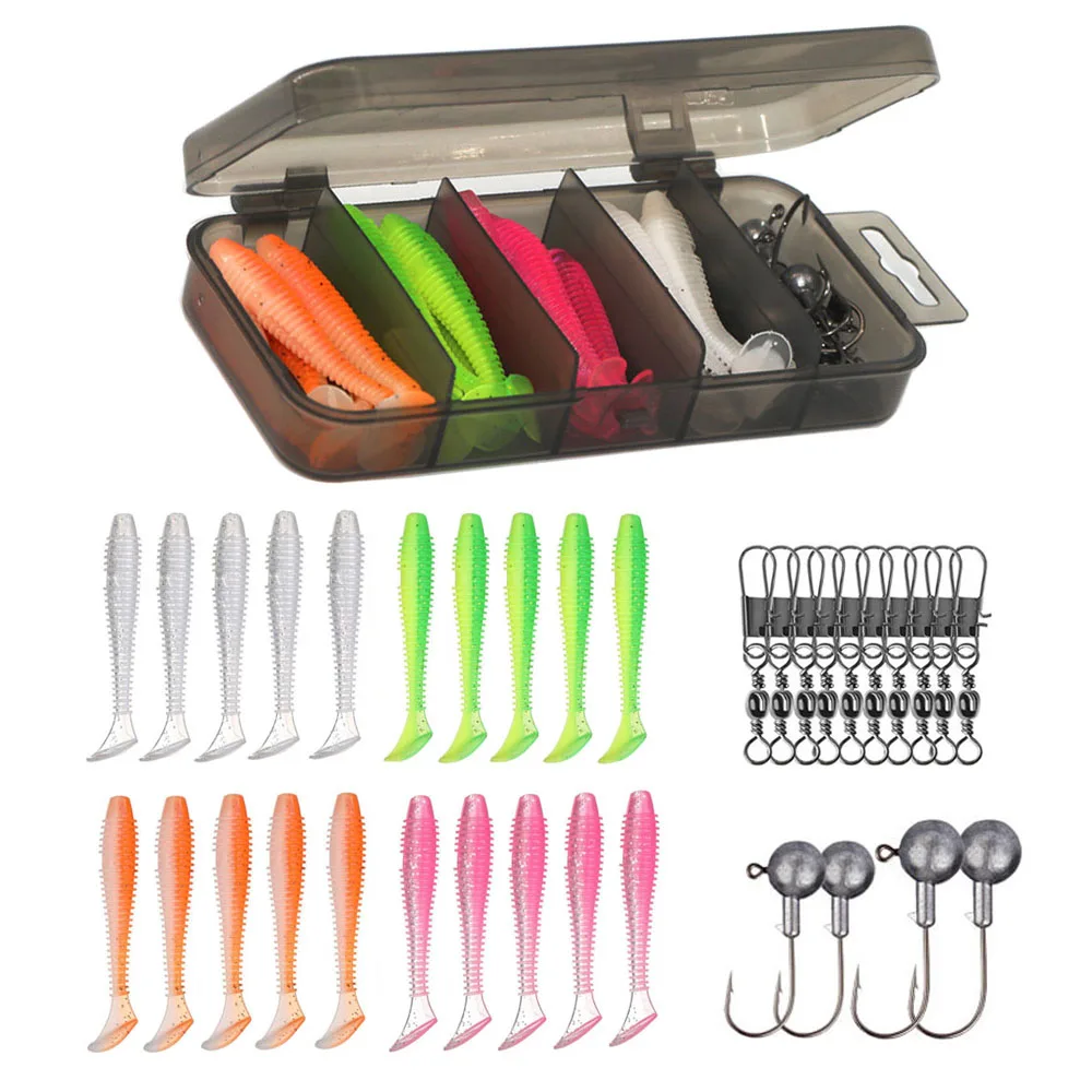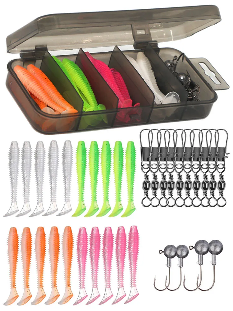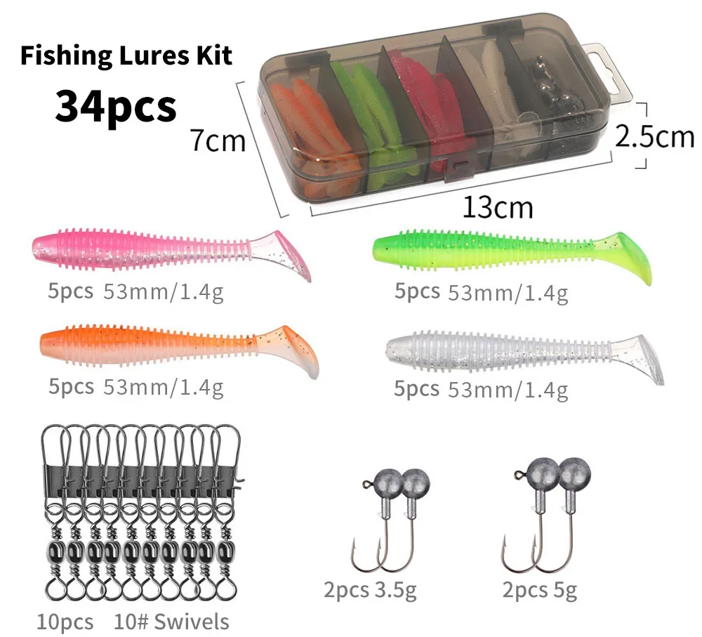Kit de Señuelos de Pesca blandos, 34 Uds., lubina, trucha, cebo artificial, Swimbait de silicona, cabezales de plantilla, gancho giratorio, caja de aparejos de pesca