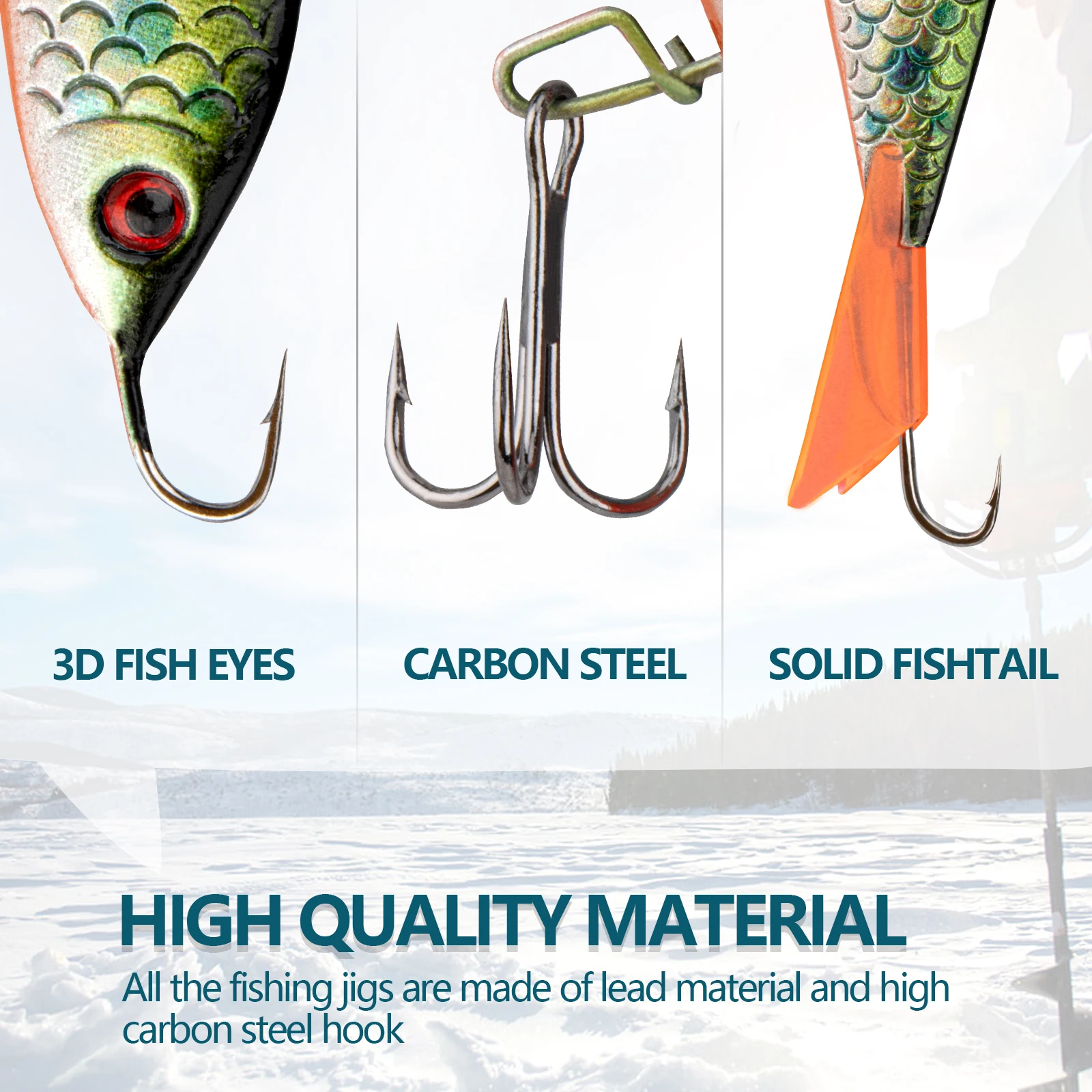 Artículo: plantilla de pesca en hieloCantidad: 38 piezasPeso: 1,1 g (1/26 oz), 1,3 g (1/100 oz), 1,6 g (1/18 oz), 1,7 g (1/17 oz), 1,8 g (1/16 oz), 7 g (1/4 oz), 10 g (3/8 oz)El paquete incluye: 38 Uds. Señuelos de pesca en hielo