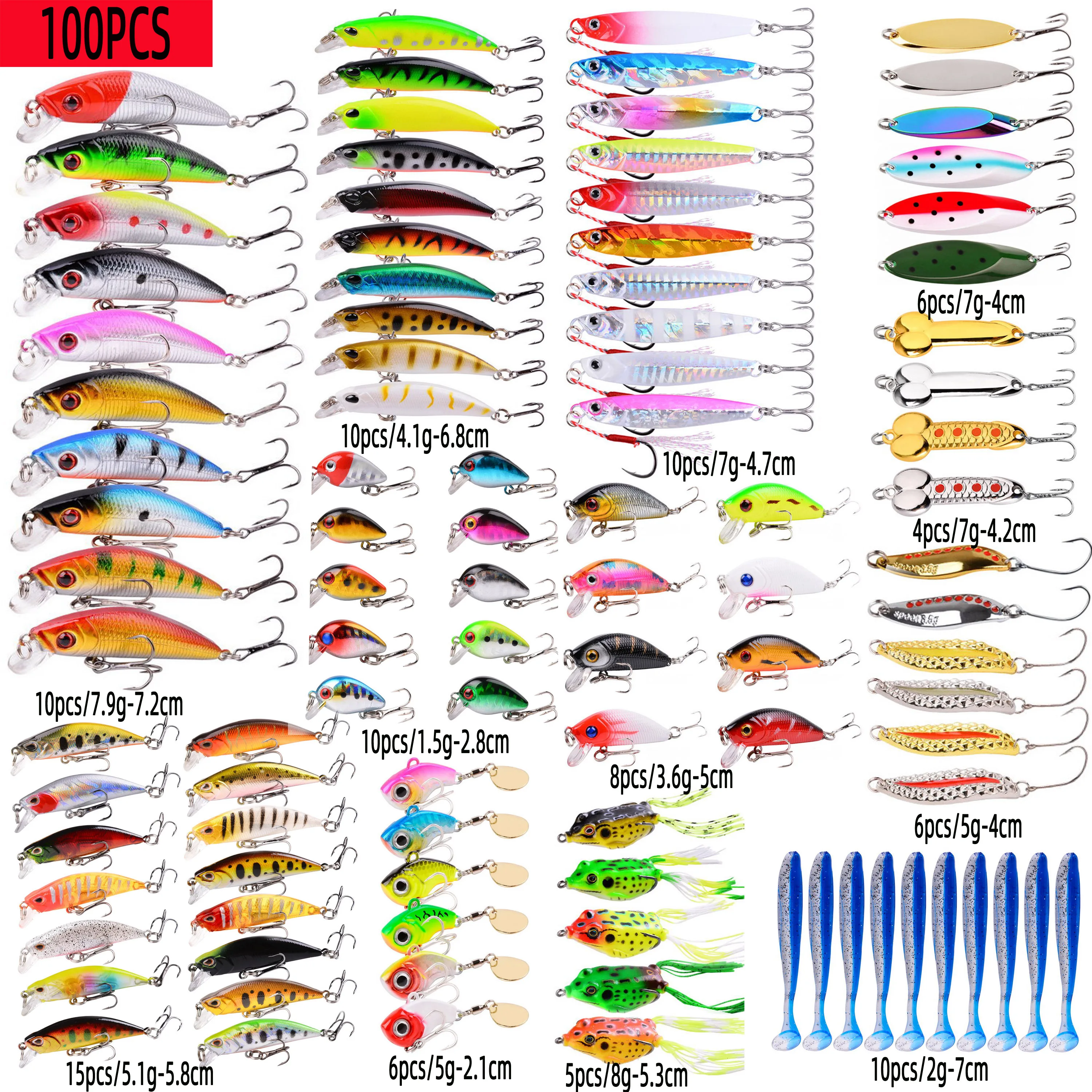 Kit de Señuelos de Pesca mixtos, Crankbait Minnow, plantilla de Metal, cuchara, señuelo suave, cebos de lubina, juego Wobbler, aparejos de cebo de pesca falsos realistas, 100 Uds.