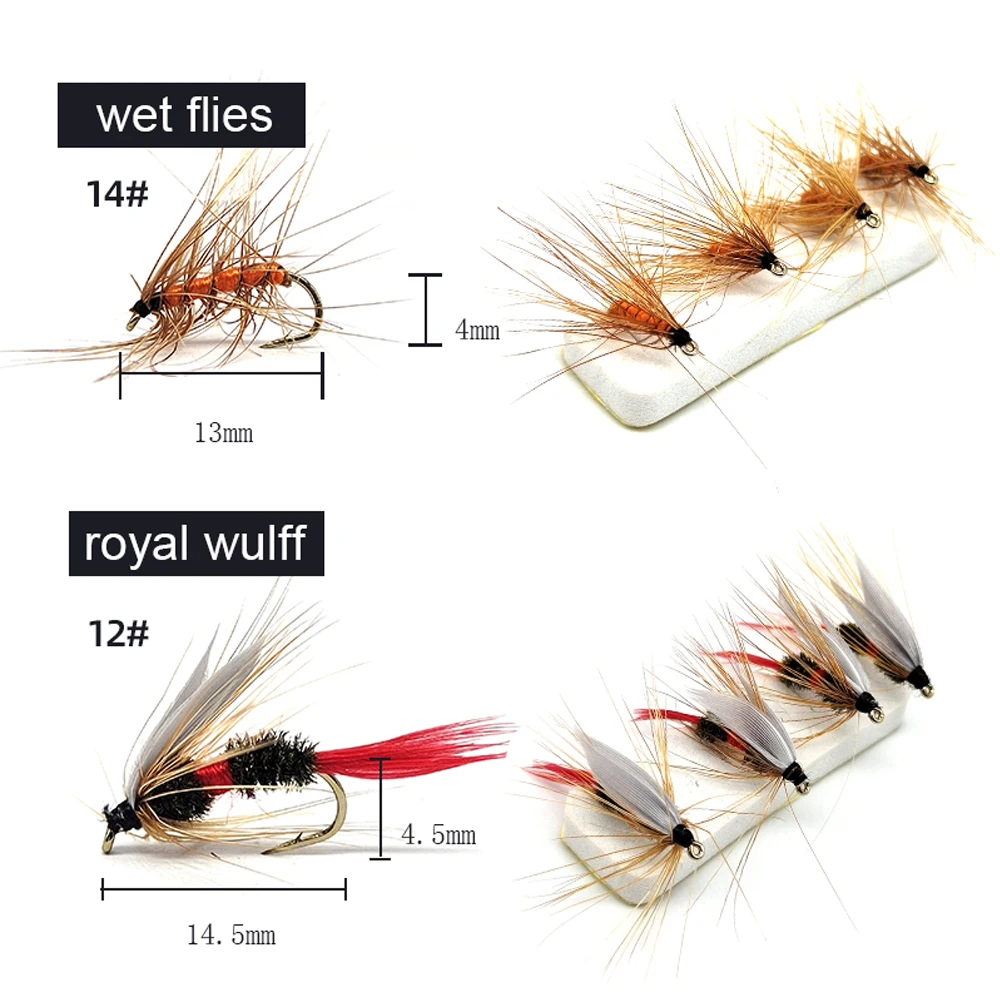 Información detallada del kit de moscas de pesca de 64 piezas (húmedo, seco, ninfa, serpentina):