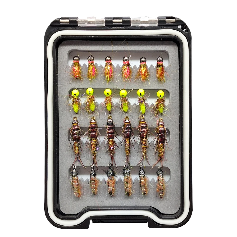 ◆El surtido de moscas incluye ninfas versátiles, de uso frecuente y de hundimiento rápido y moscas de gusano Scud.