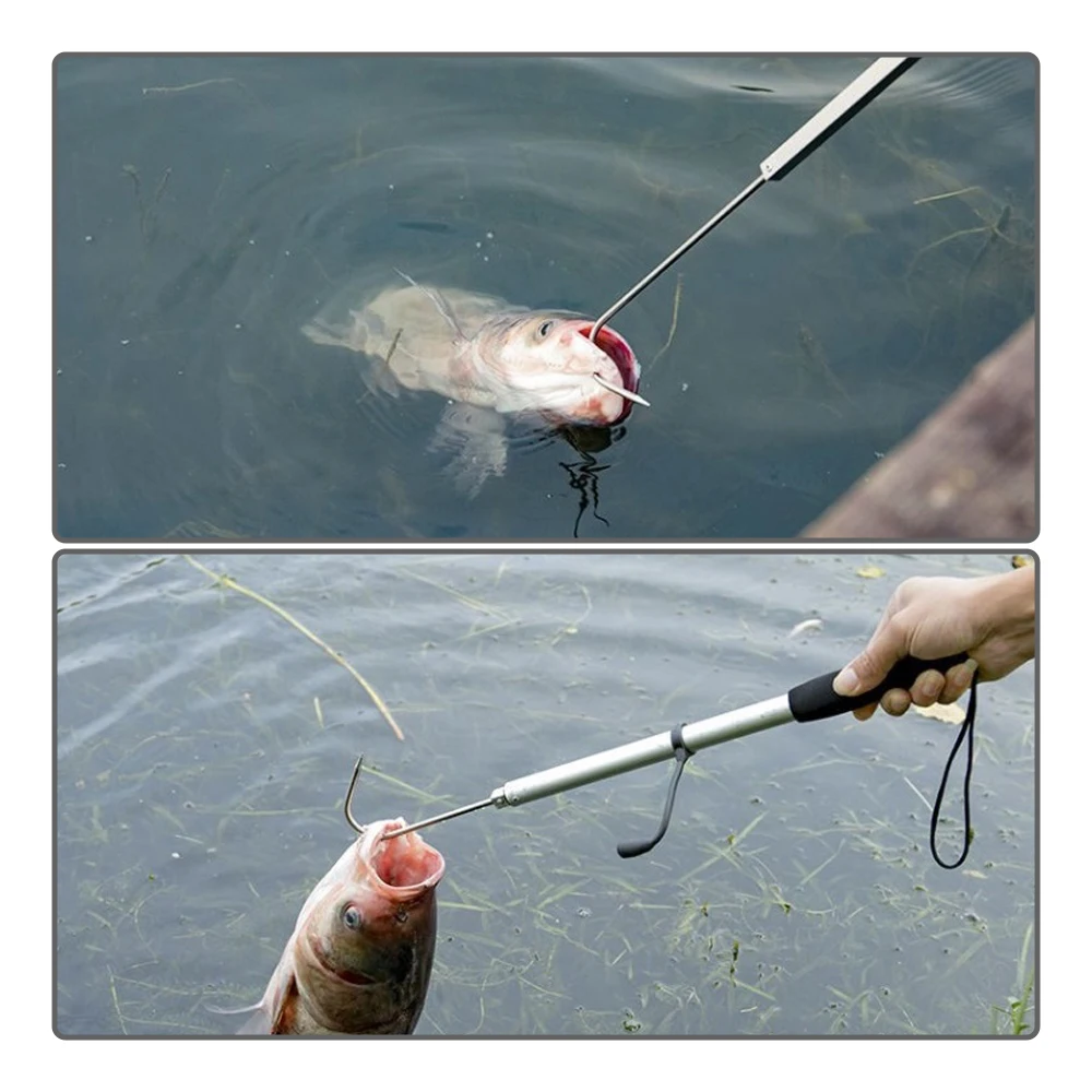 Estírese hasta obtener una longitud adecuada, inserte directamente la punta del anzuelo en el cuerpo del pez o en la boca del pez y levante el pescado fuera del agua.