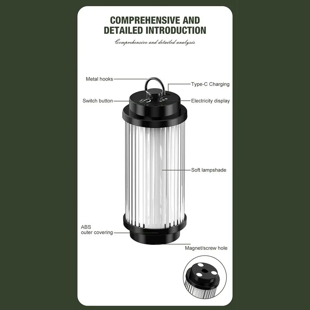 Brand New and High Quality! Product Name: Camping Lamps Material: ABS+ Metal Color: As the Picture Shown Size: 127*45mm Power supply: Charging V: 3.7 W: 5 Switch type: Button -Features: 1. Durable Metal + ABS Material: Constructed from a robust combination of metal and ABS, this camping lamp is built to withstand the rigors of outdoor adventures, ensuring longevity and durability. 2. Adjustable Three-Light Modes: Featuring three adjustable light modes, this lamp provides versatile lighting options to suit various camping needs, from a bright spotlight to a cozy ambient glow. 3. Magnetic Design: With a built-in magnetic base, this lamp can easily attach to any metal surface, offering convenient and hands-free lighting wherever you need it. 4. 2000mAh High-Capacity Lithium Battery: Equipped with a powerful 2000mAh lithium battery, this lamp ensures extended use, and can be easily recharged via the included TYPE-C charging port. 5. Portable and Shock-Resistant: Lightweight and portable, this lamp can be hand-held or hung up as needed. Its shock-resistant design ensures it can handle drops and impacts, making it perfect for rugged outdoor use. Package Includes: 1pc Camping Lamp Note: 1. Due to factors such as lighting, display color deviation, personal understanding of color and other factors, it is inevitable that there will be a certain degree of color difference between the real object and the picture,please understand! 2. Since it is a manual measurement, please allow an error of 1-3cm(0.39-1.18in), please understand!