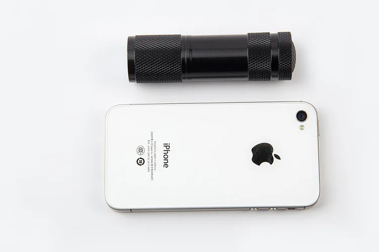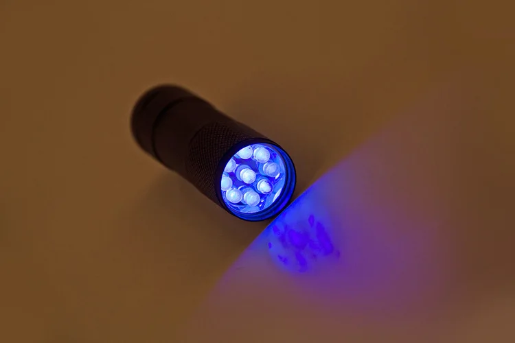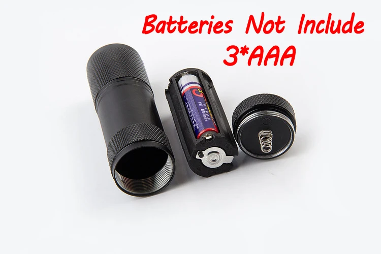 Especificaciones:-Material del cuerpo: aleación de aluminio-Tamaño: 87mm X 26mm; aproximadamente 32g de peso neto.-Luz: 9 LED Frecuencia UV: 365nm ~ 400nm