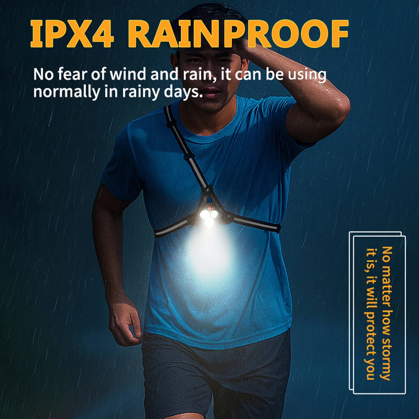 4.IPX4 Resiliencia al agua: No hay necesidad de preocuparse por el viento y la lluvia.Esta luz de pecho está diseñada para ser tan normal en días lluviosos, brindando una protección confiable en cualquier clima.
