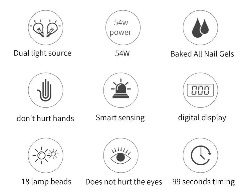4. 【Alta potencia】 Potencia máxima de 54W, 18 cuentas de lámpara grandes de doble lámpara tienen una cocción de pegamento más rápida y uniforme, sin contracción y mayor vida útil.