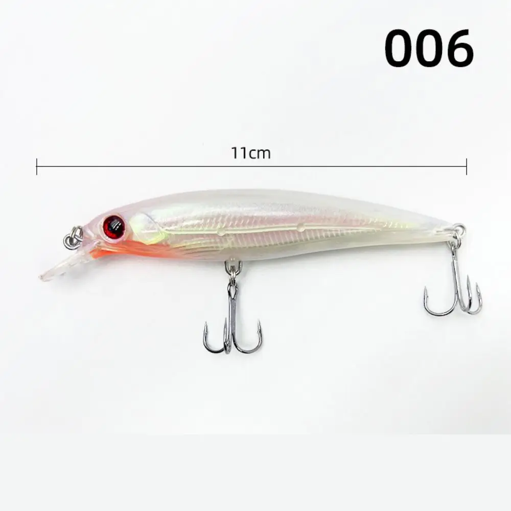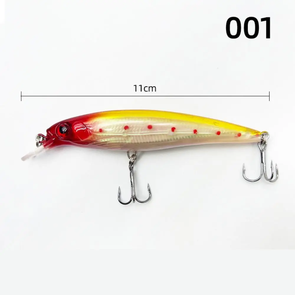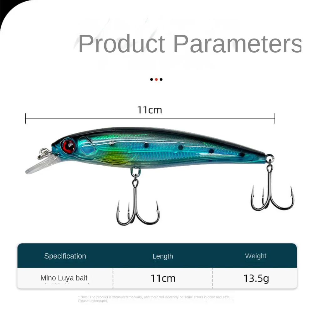 Tipo: cebo artificial. Categoría: señuelo. Color: 10 colores disponibles. Tamaño: 11cm (4,33 pulgadas). Peso: 13,5g/Pieza. El paquete incluye: 1 cebo. Las mediciones se realizaron a mano, por lo que puede haber errores dentro de 1-3mm (0,04-0,12 pulgadas) o 1g. 2. Factores como la iluminación, el contraste y la pantalla a color pueden hacer que las fotos se vean ligeramente diferentes, esto no es indicativo de ningún problema de calidad del producto. 3. El tamaño se basa en las medidas reales. Las imágenes solo podemos ampliar para mostrar mejor los detalles.