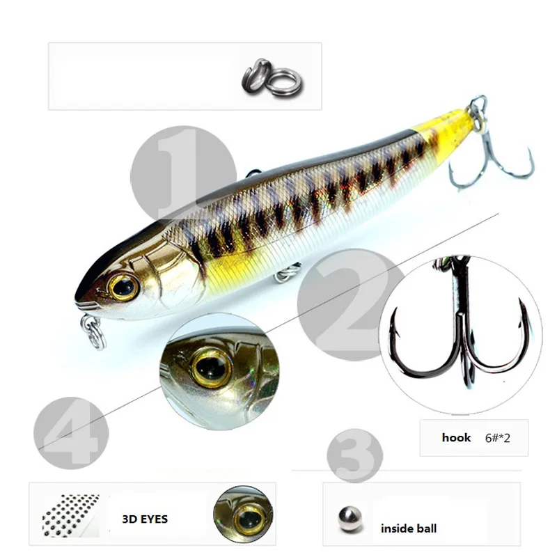 Lápiz de señuelo de pesca Stickbaits, cebo de pececillo Artificial, 95mm15g, manivela de ojo 3D, cebos duros, superficie de agua superior, Fish Tack Isca, 1PC