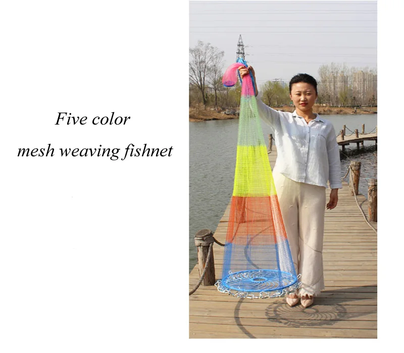 Red de mano Lawaia, red de pesca de cinco colores, monofilamento, hilo de nailon, red fundida para pesca con anillo azul, fácil de lanzar red