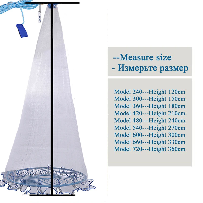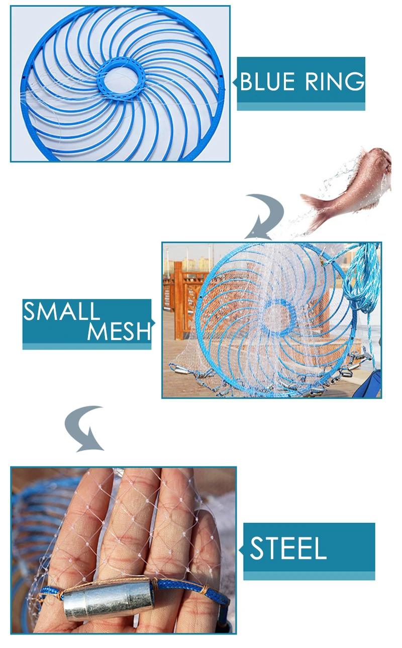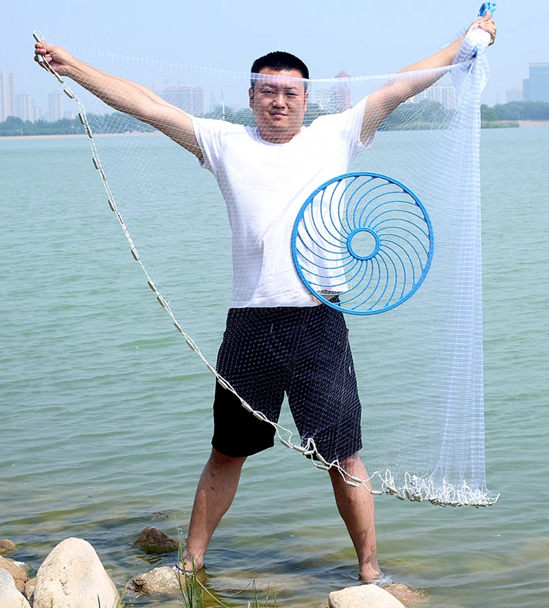 Herramientas de pesca más vendidas para pescadores.Red duradera y cómoda, maravillosa para la pesca con zapatos de estanque de río.Diseño de anillo grande azul, área de lanzamiento grande, le ayuda a capturar más peces.La malla pequeña puede evitar que los peces pequeños escapen.Detalles del producto:Tipo: red de pesca fundida a manoMaterial: línea de nailon monofilamentoPlomos: plomos de acero de hierro galvanizadoAnillo: con anillo azulTamaño de la malla: alrededor de 1 dedoLista de paquetes:Red de pesca * 1 ud.Especificación:
