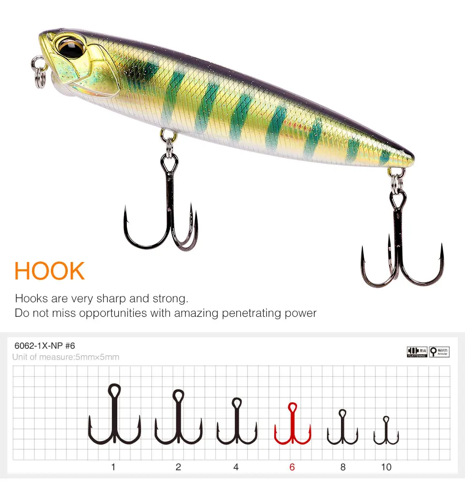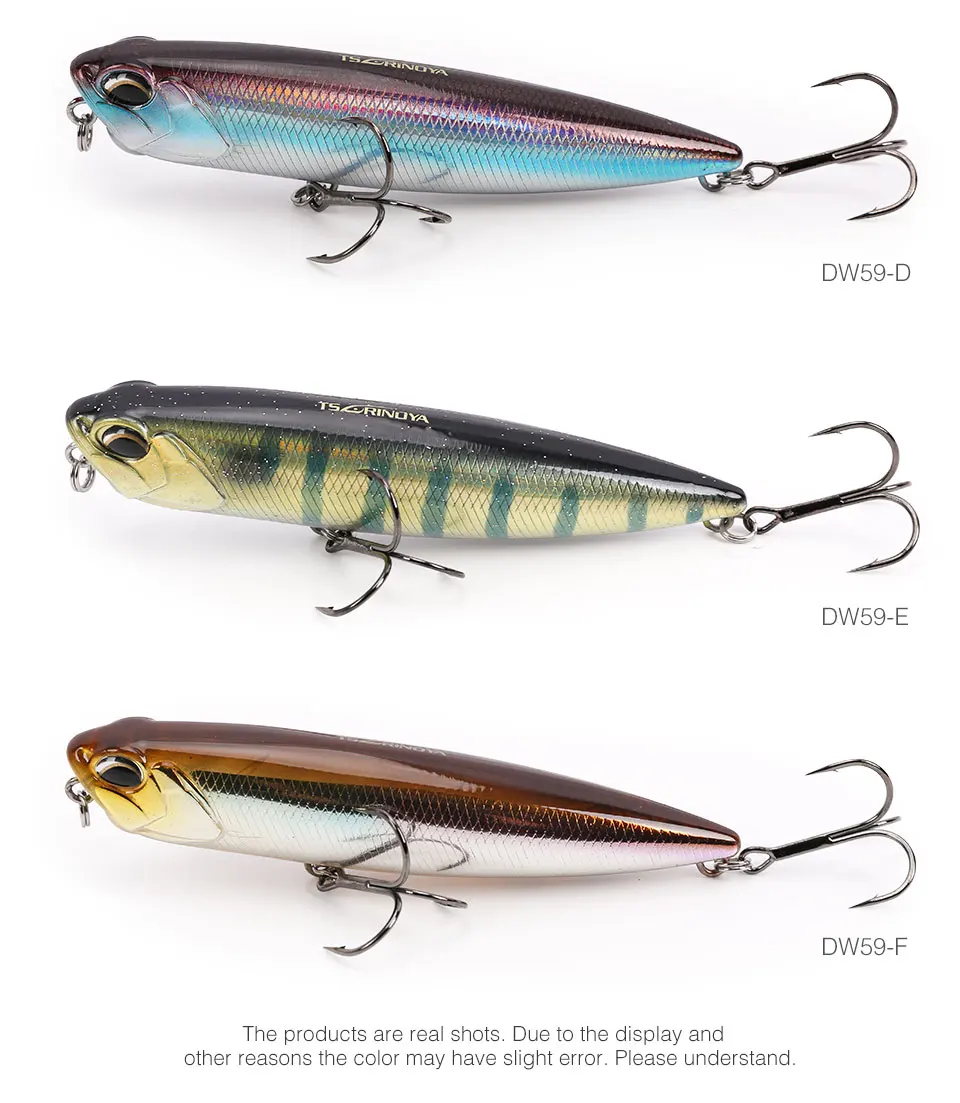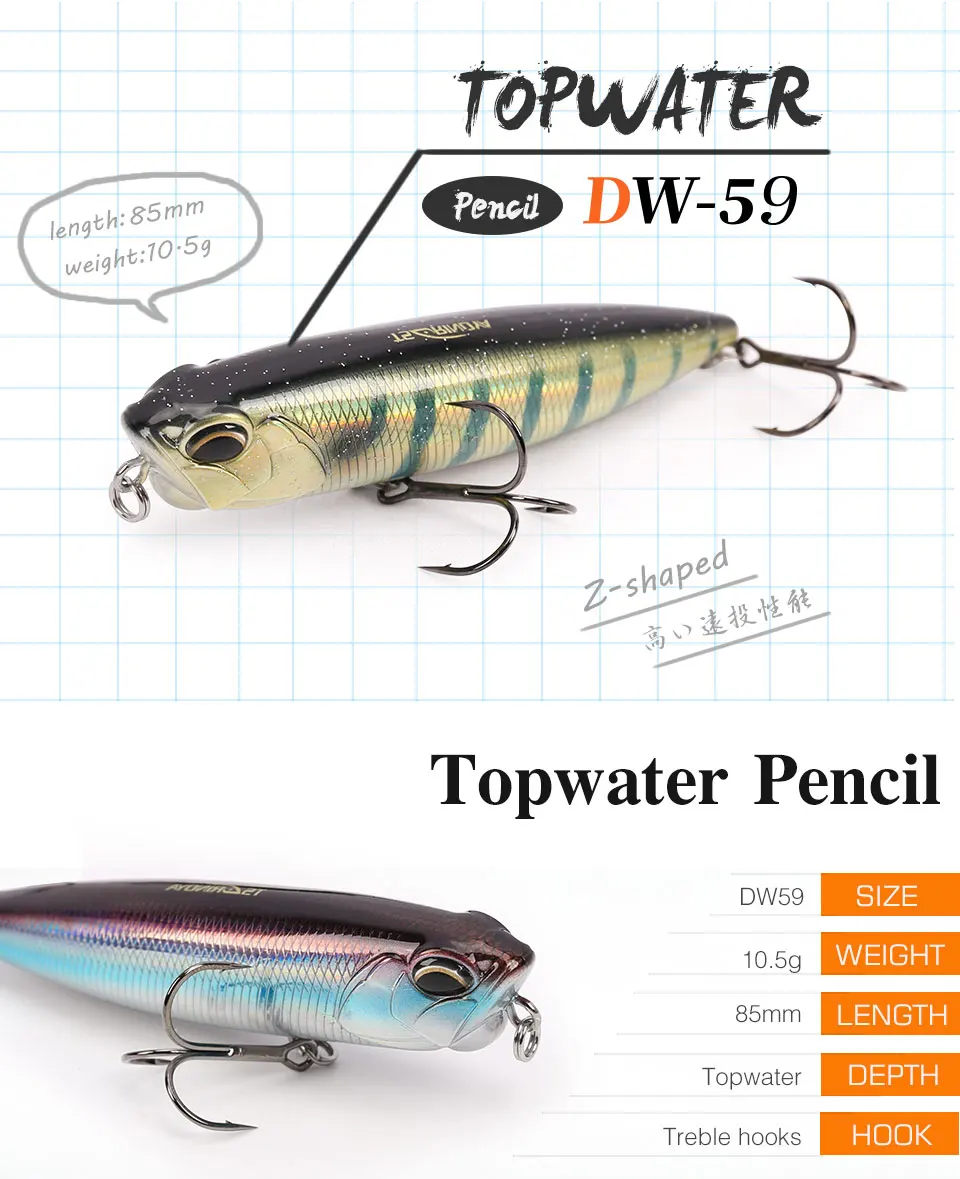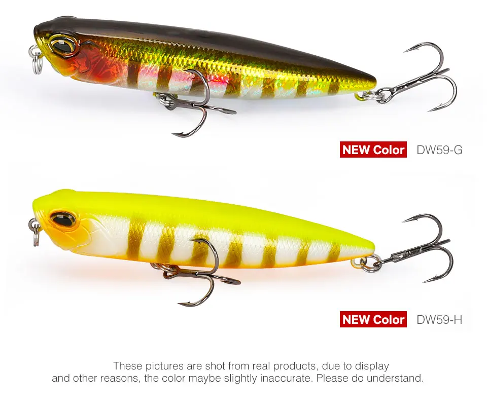 DW59 es un señuelo de lápiz de agua superior. Cuerpo fuerte, escamas de peces con efecto láser puede reflejar la luz exterior desde todos los lados, debido a la maravillosa tentación.