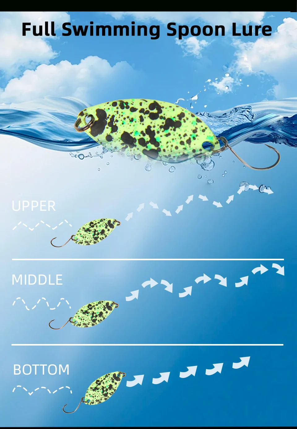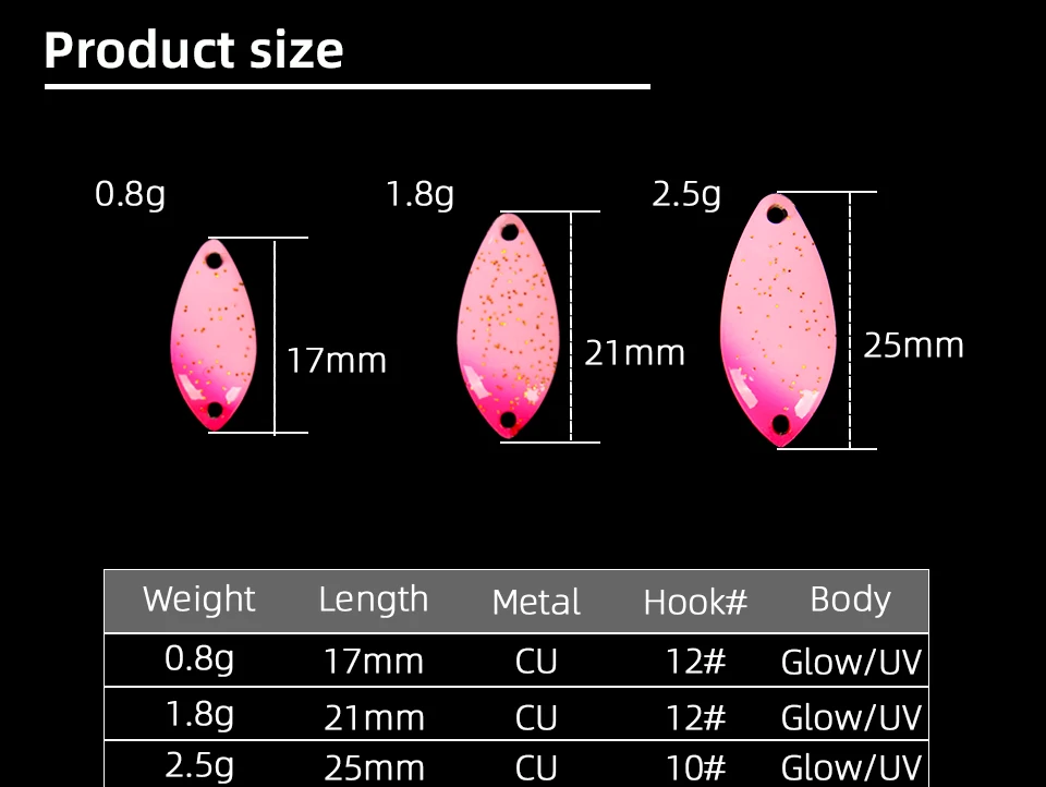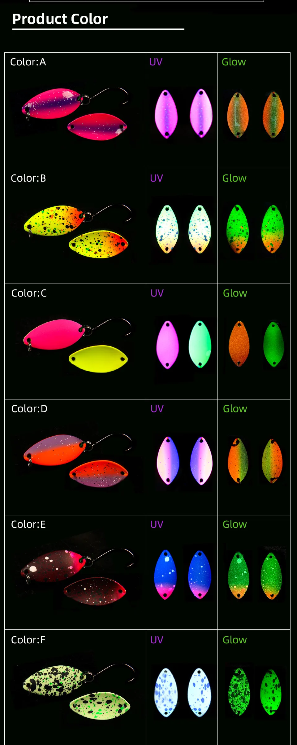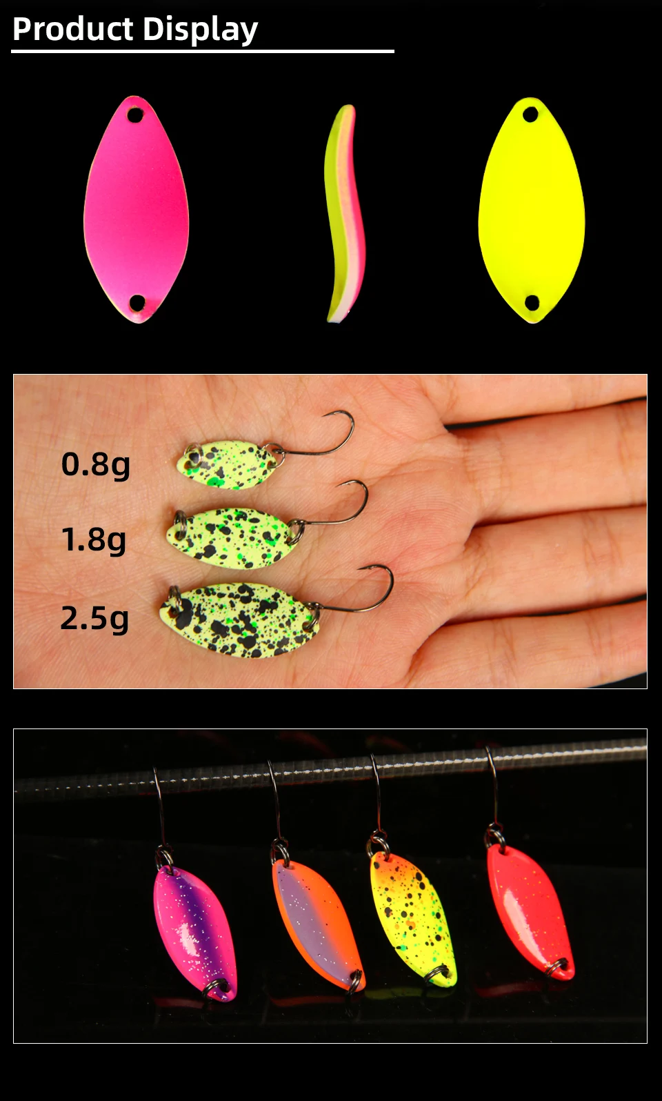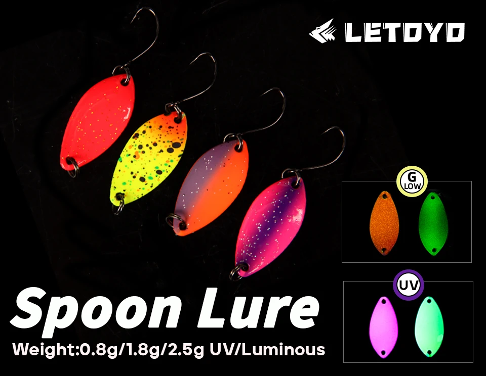 LETOYO 0,8/1,8/2,5g Mini señuelo cuchara luminoso cebo giratorio UV señuelo duro cebo Artificial perca pesca señuelo área trucha
