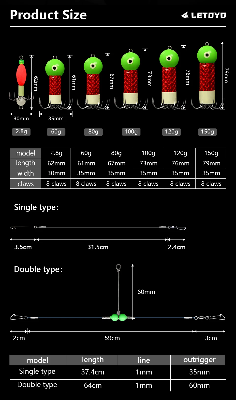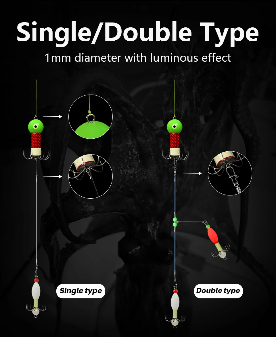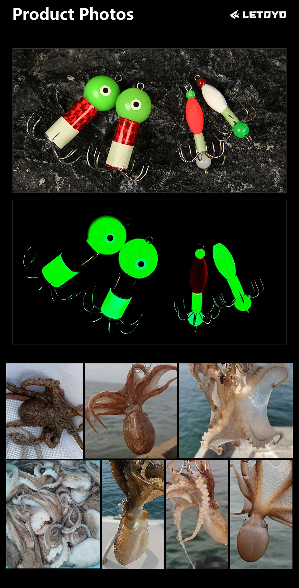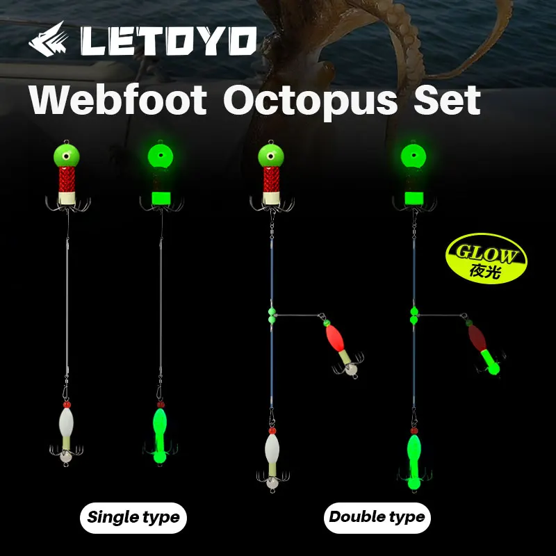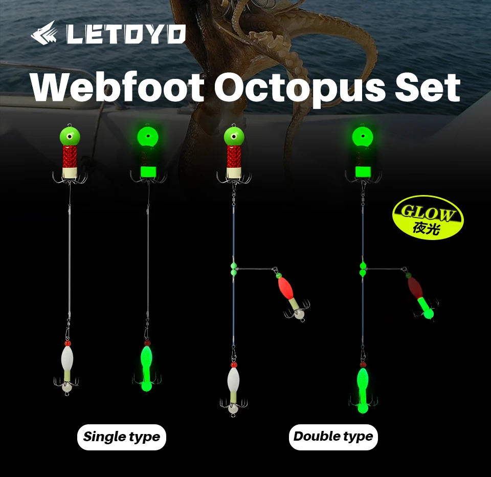 LETOYO-Juego de señuelos de pulpo individual doble, 100cm/140cm, Webfoot luminoso, señuelos de pulpo, plantilla de calamar, cebo Artificial, pesca de pulpo