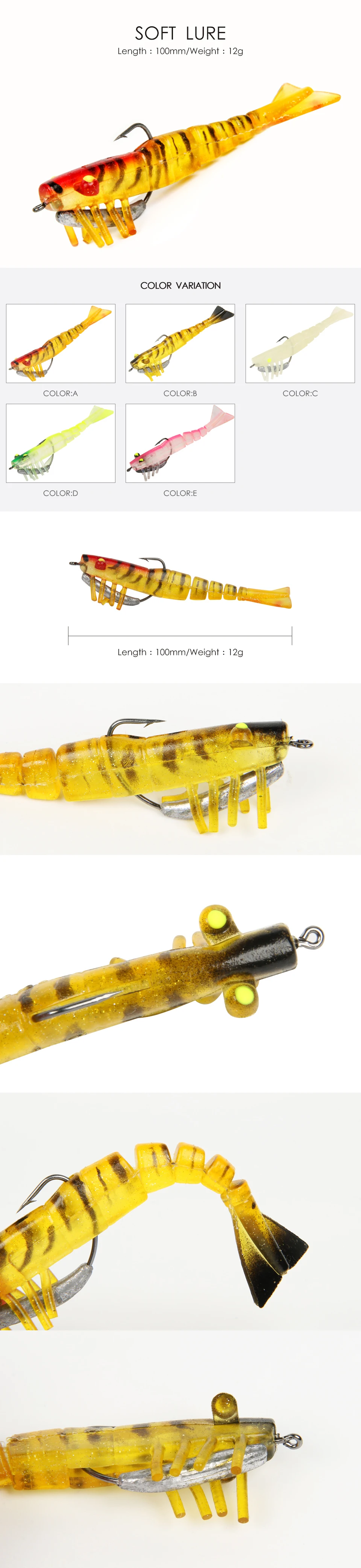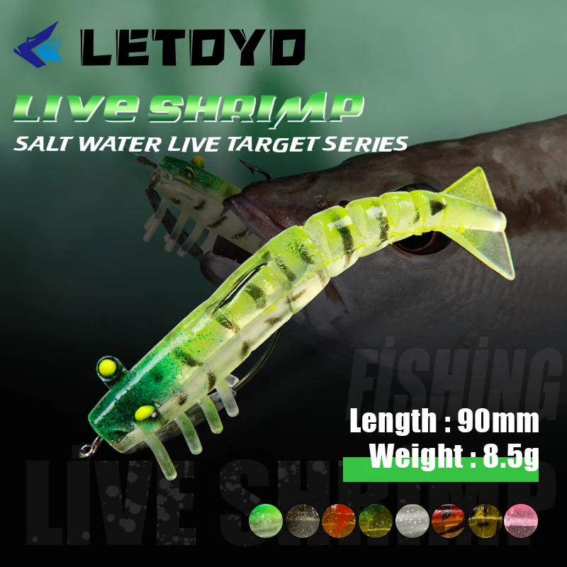LETOYO-señuelo de pesca de gambas con sonajero, 100mm, 90mm, camarones suaves, Señuelos de Pesca de Mar, cebo de silicona giratorio Artificial, pesca en roca