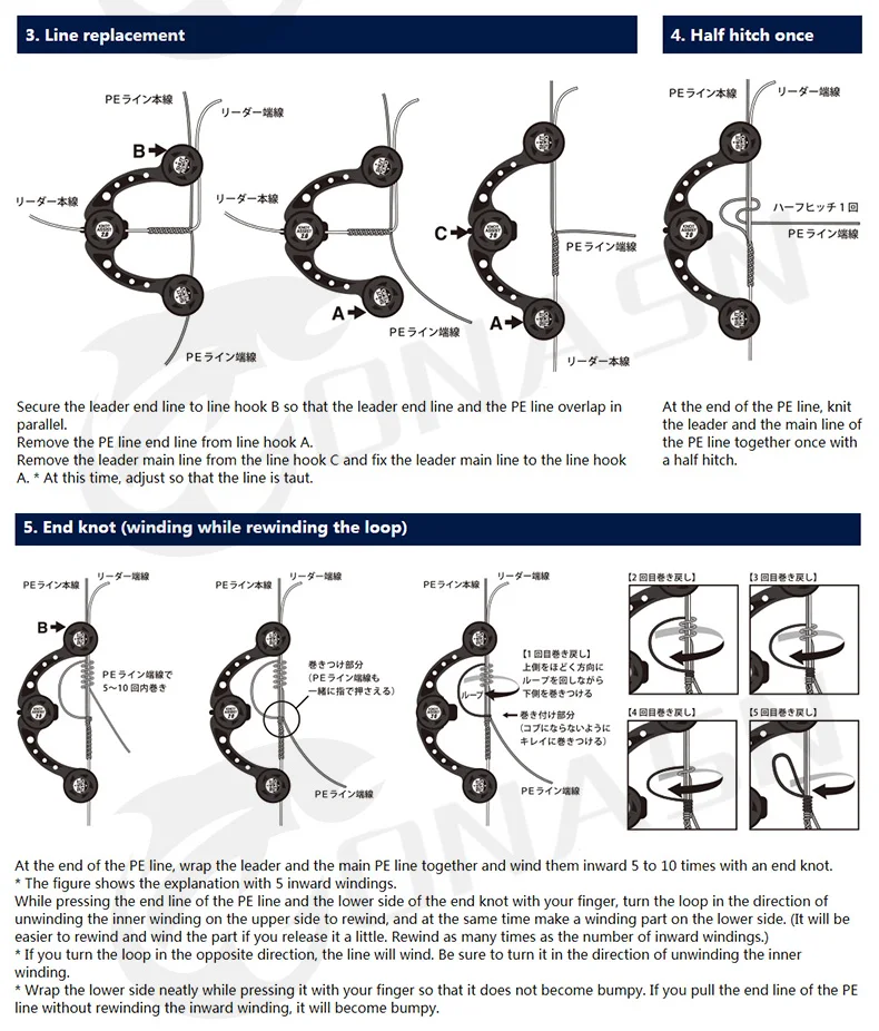 El gancho de línea corrugada de tipo interruptor y el brazo compensado le permiten atar fácilmente, de forma segura y rápida la línea PE y el líder con nudos FG.