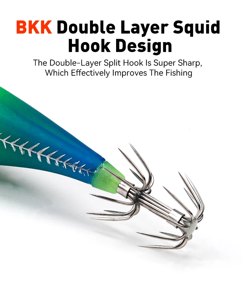 2.Anzuelo afilado BKK: el anzuelo BKK es súper afilado, lo que mejora efectivamente la tasa de éxito de la pesca del aparejo luminoso de calamar de agua salada y evita que los peces se escapen.