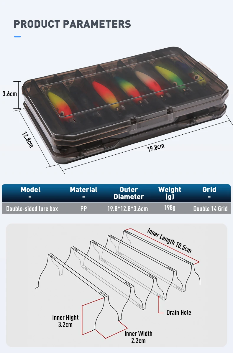 1.Duradero: el señuelo de pesca está hecho de ABS de alta calidad, que es resistente a la compresión, anticolisión, a prueba de óxido y a prueba de explosiones.