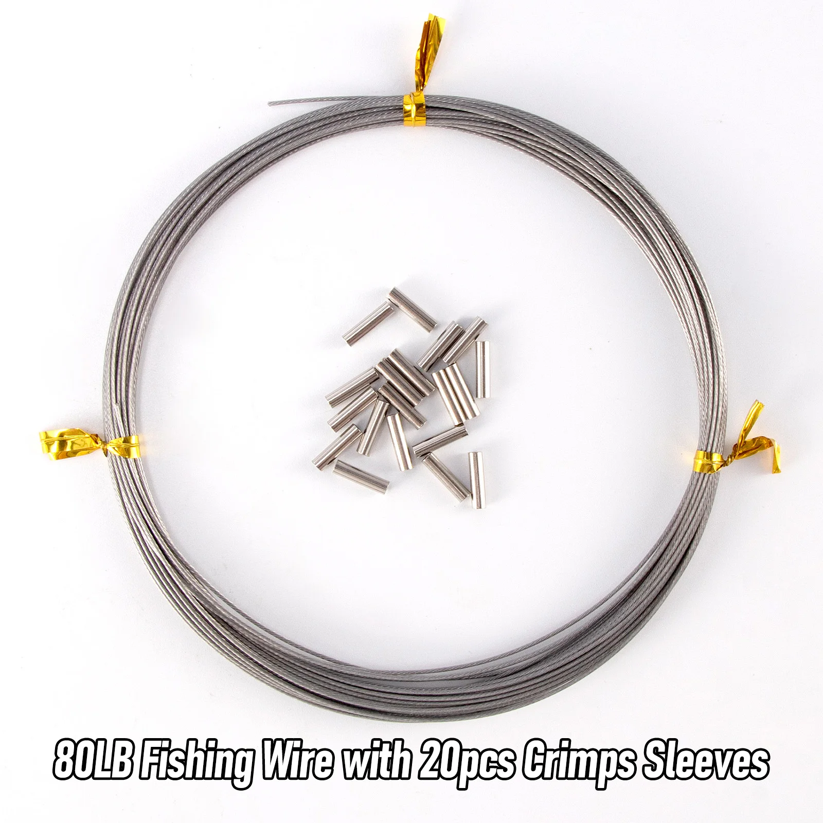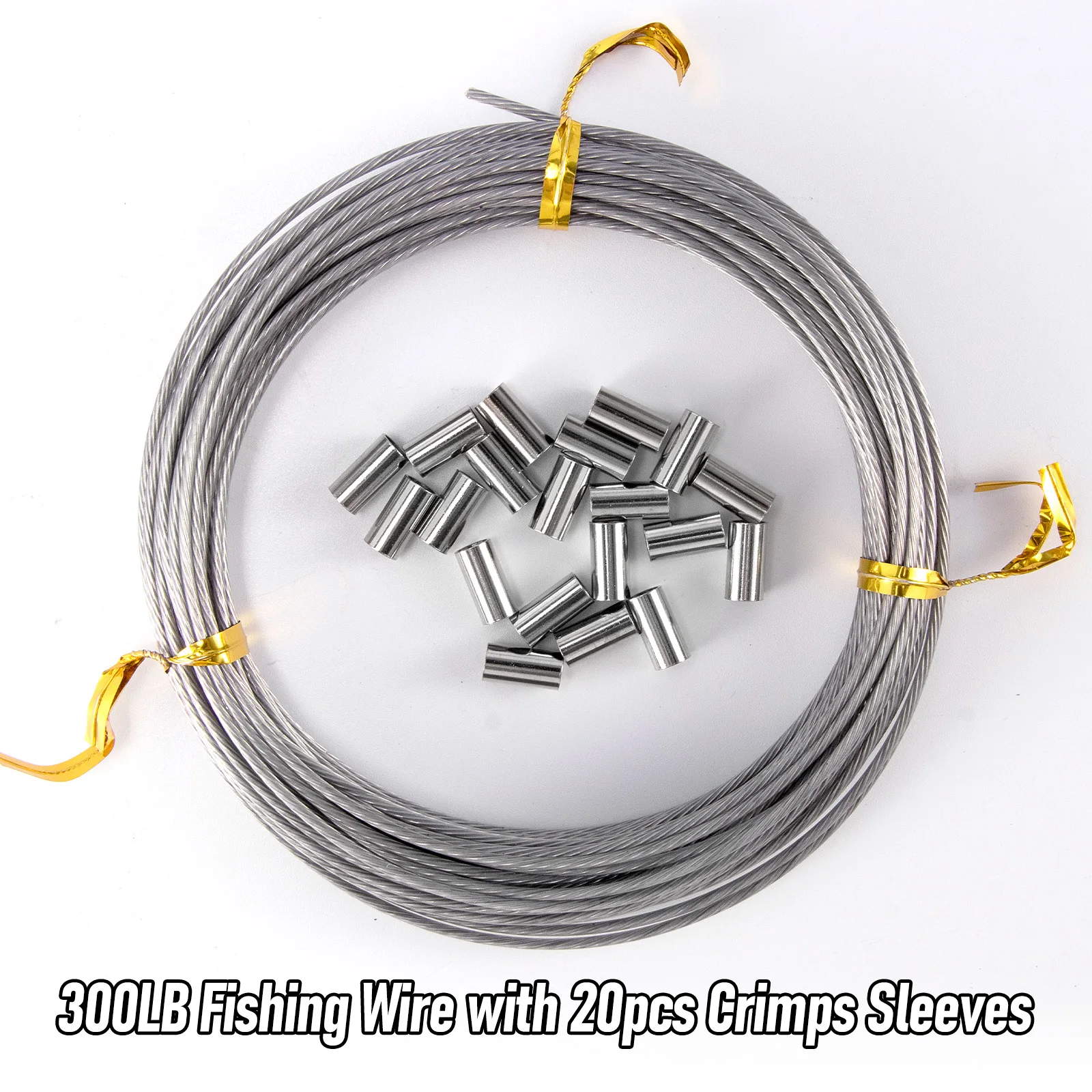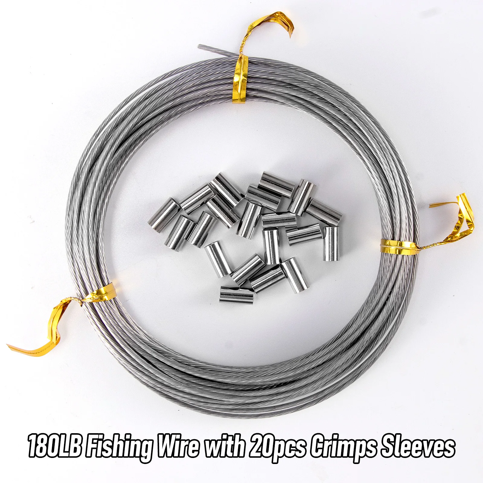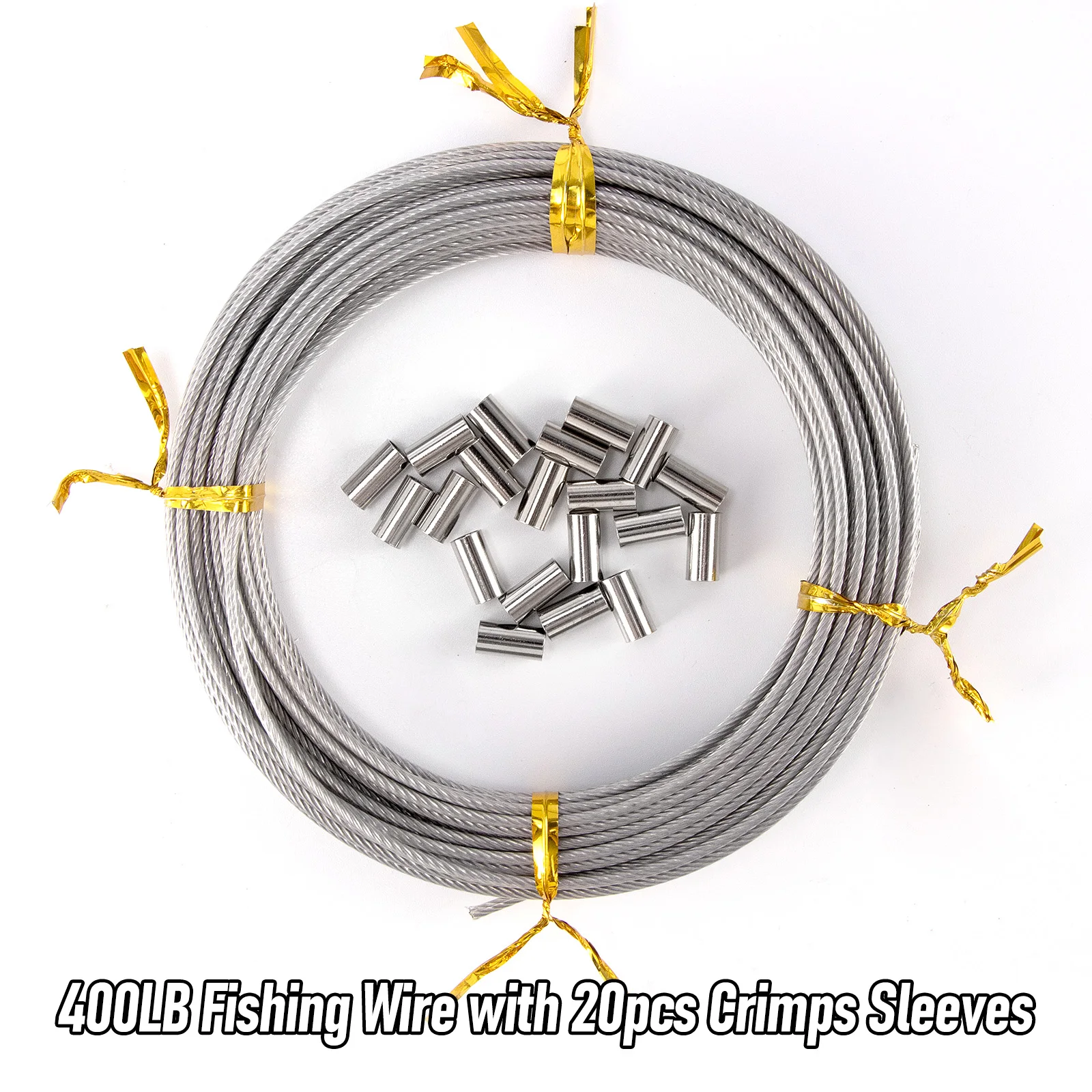 Paquete: Recibirá alambre de pesca de acero inoxidable de 8LB a 400LB con mangas individuales de 20 piezas. Longitud: 32,8 pies.