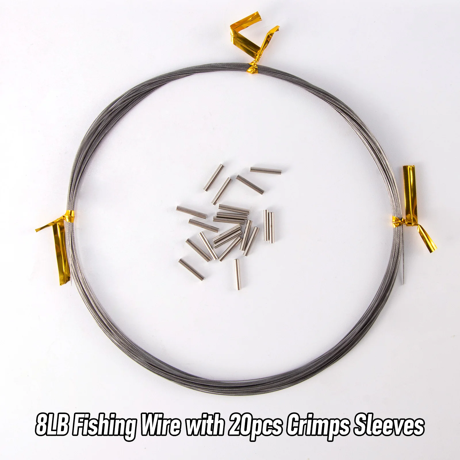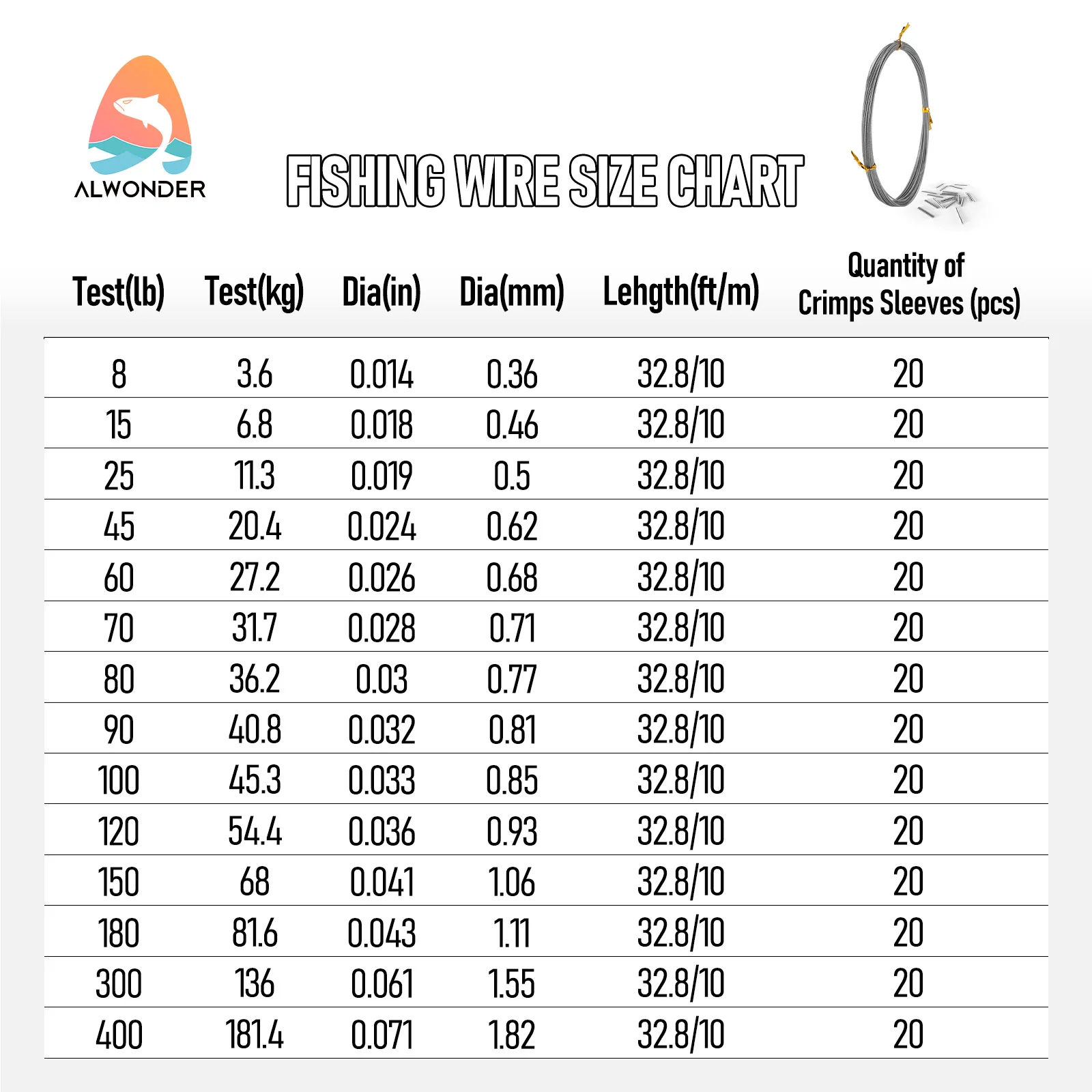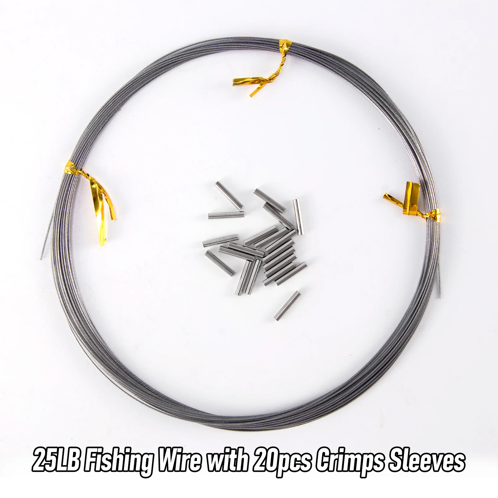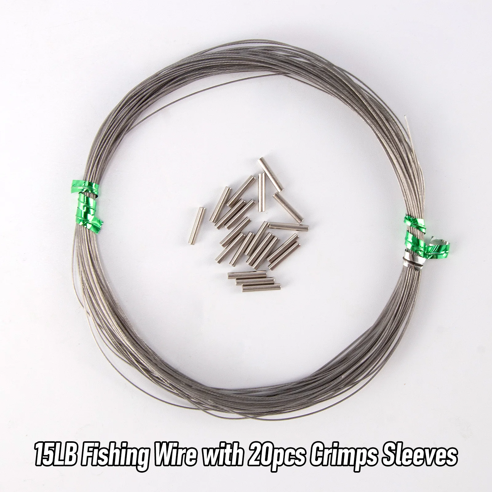 Paquete: Recibirá alambre de pesca de acero inoxidable de 8LB a 400LB con mangas individuales de 20 piezas. Longitud: 32,8 pies.