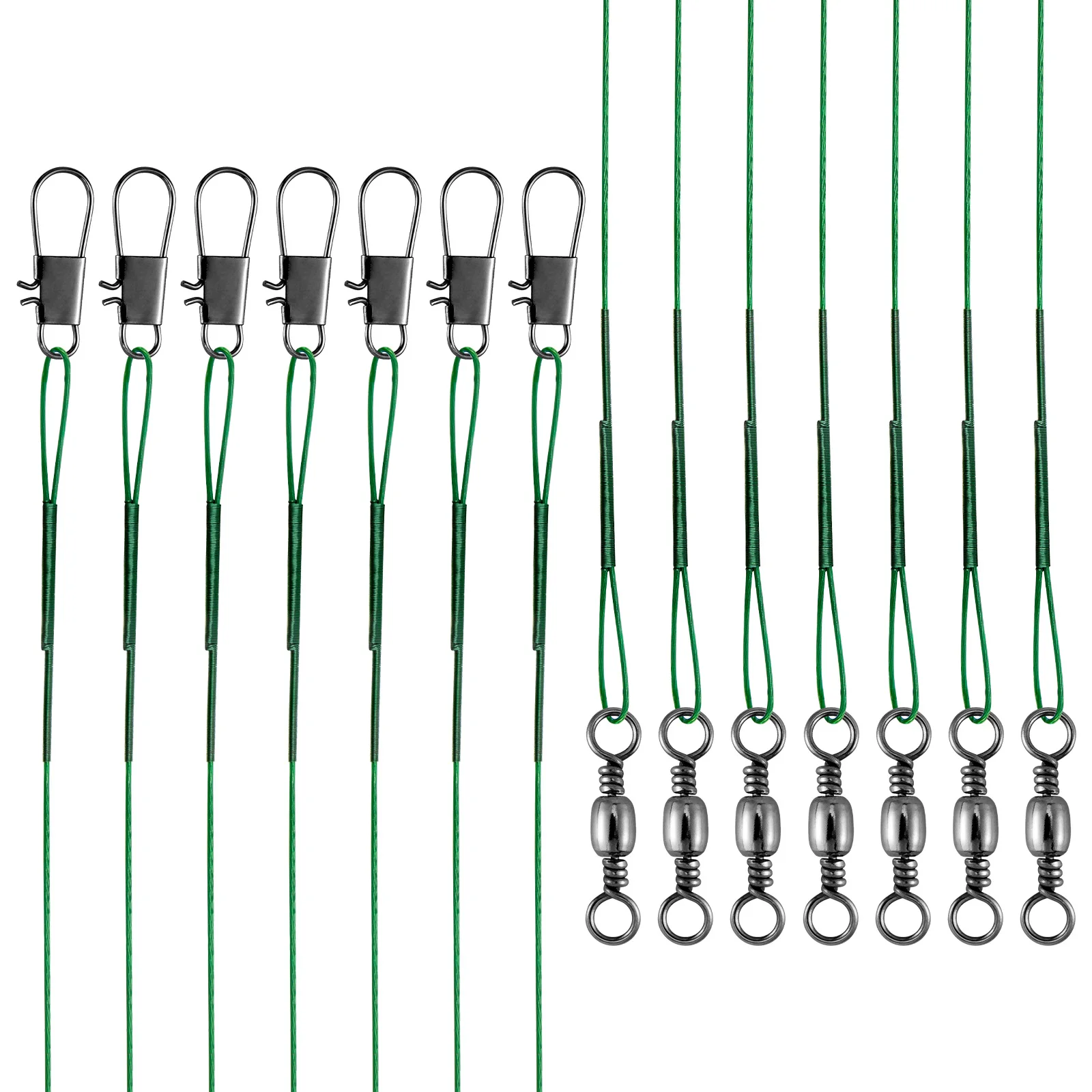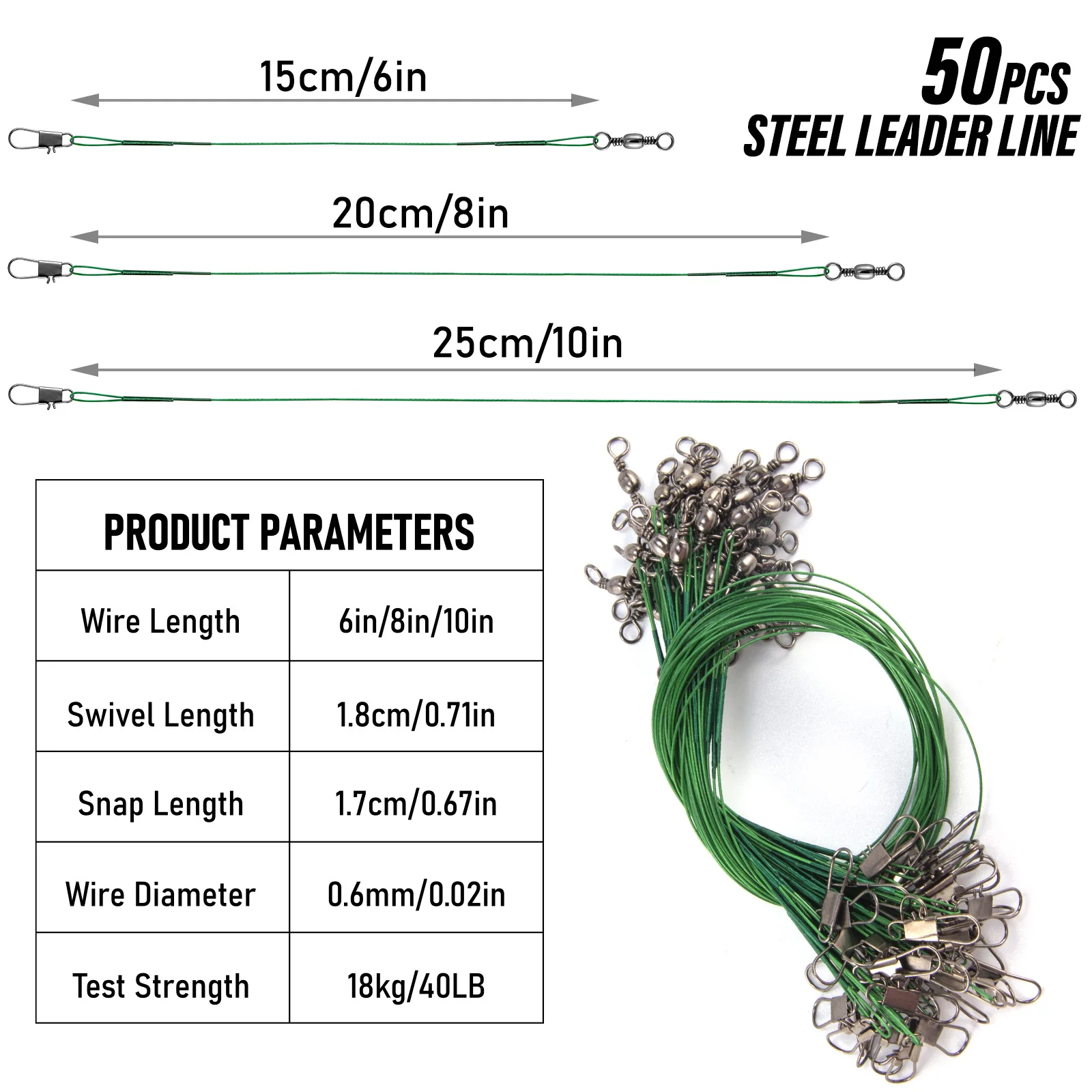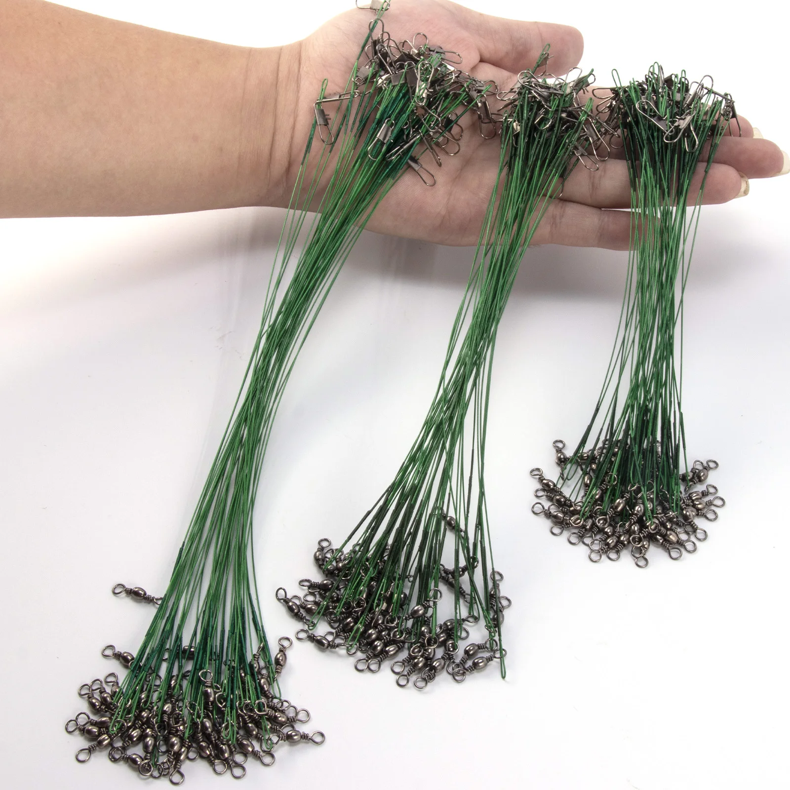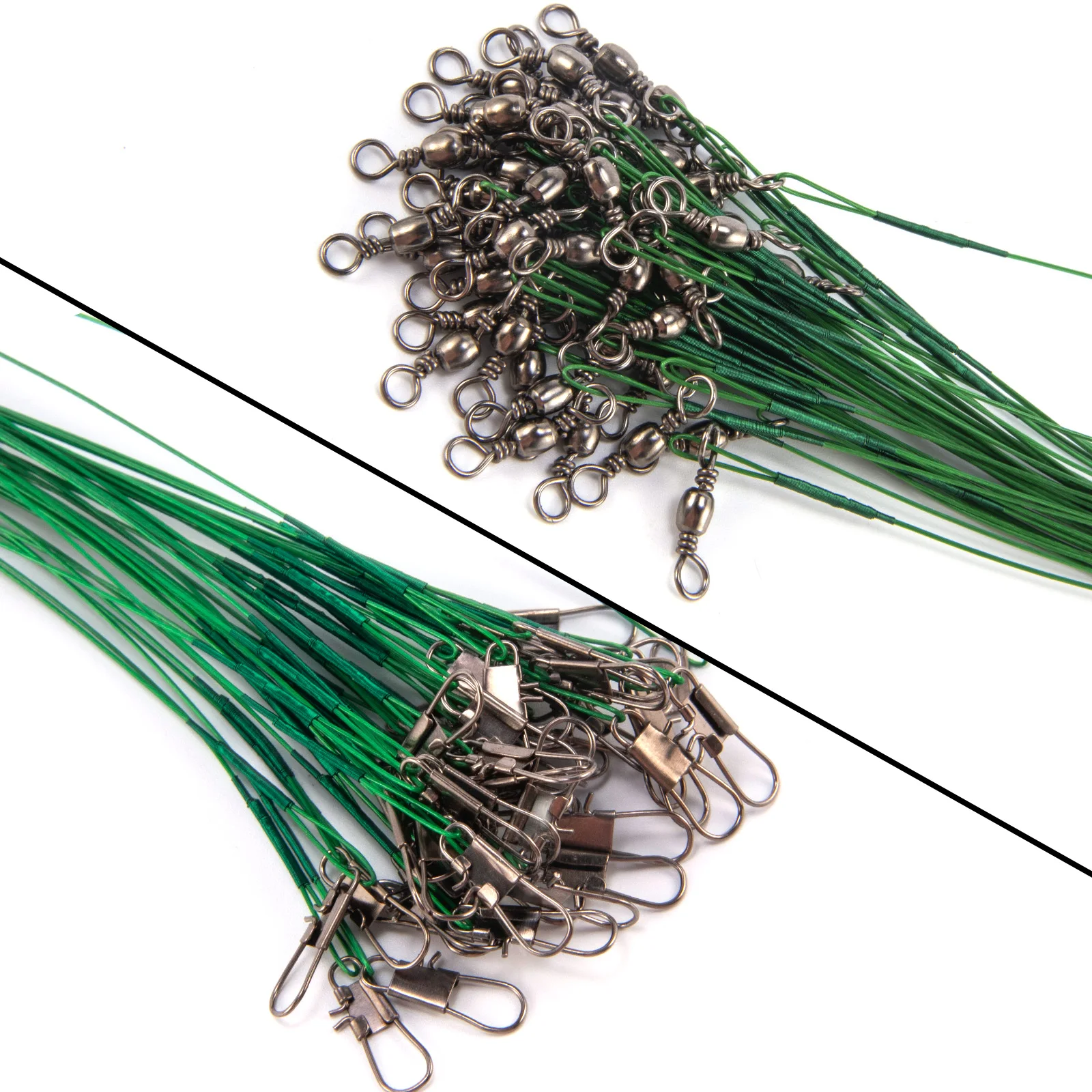 ESPECIFICACIONES: 50 Líderes de alambre de pesca de. Color: verde. Fuerza de prueba: 40LB. Tamaño: 6 pulgadas.