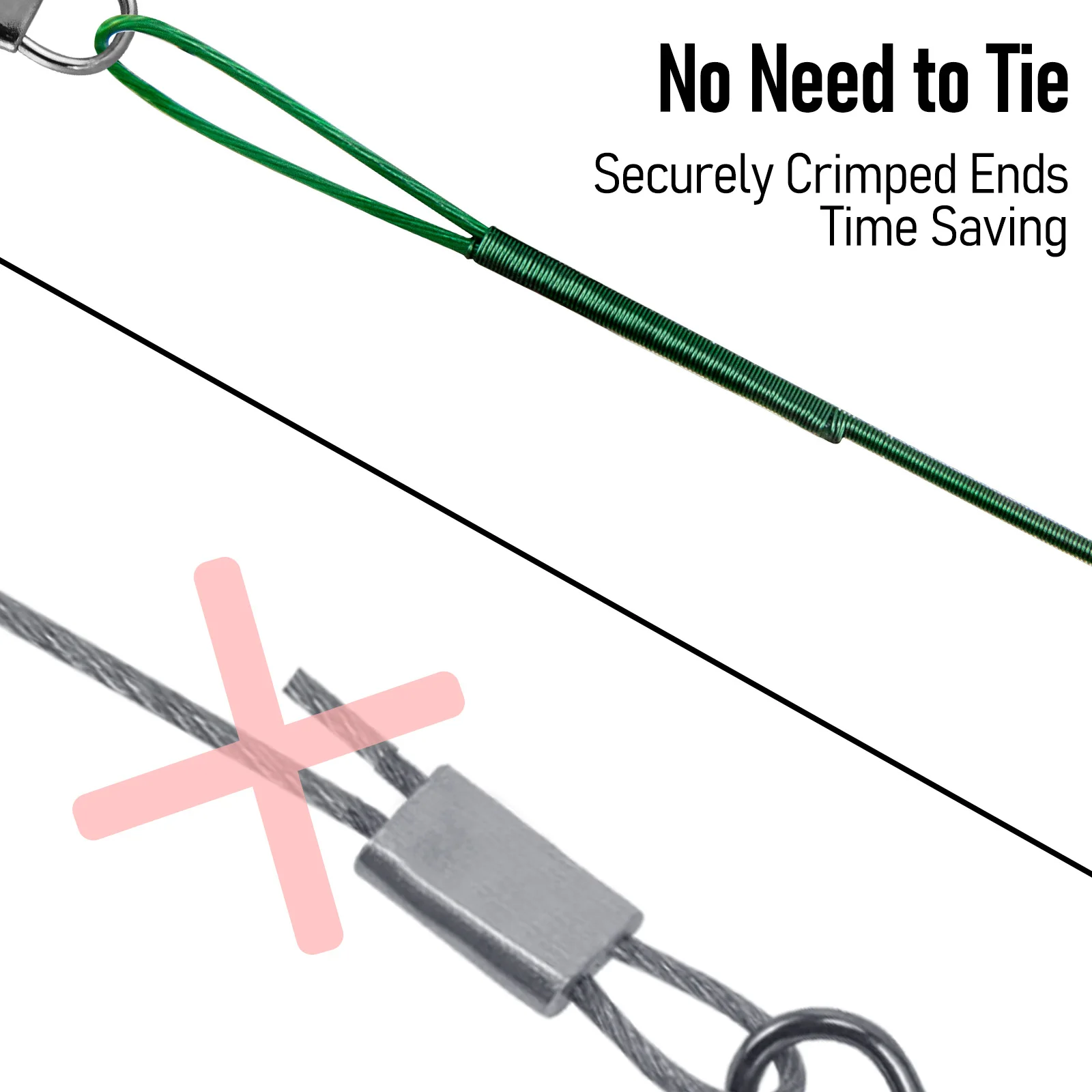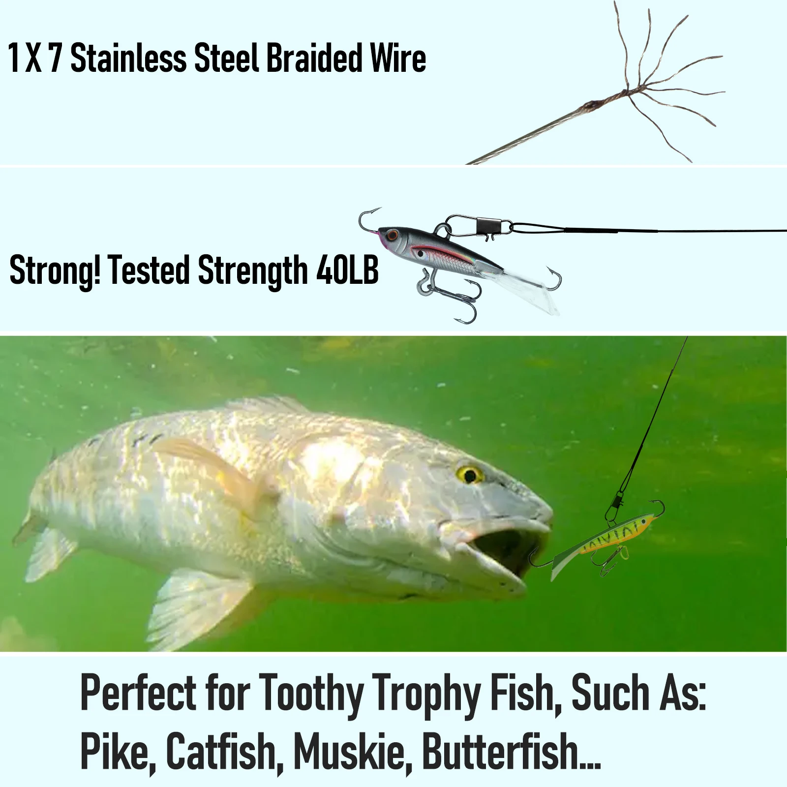 AMPLIA APLICACIÓN: estos líderes de acero son ideales para la pesca de la mayoría de las especies, pero especialmente para peces con dientes, como Lucio, bagre, Muskie, butterfish, trucha, crappie, rayado, lubina, garra de águila, lucio norteño, lucioperca, sábalo, etc.