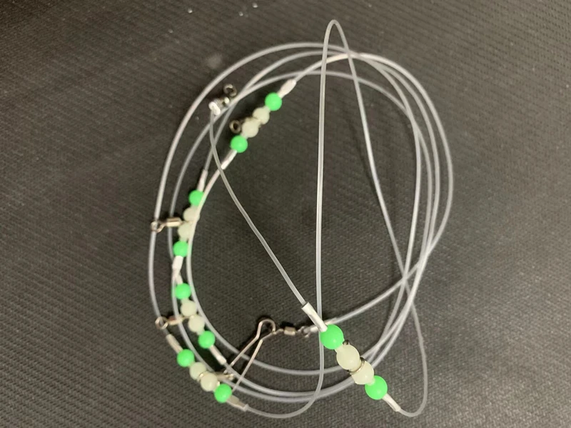 La plantilla consiste en una variedad de aparejos de pesca, que incluyen eslabones giratorios que brillan en la oscuridad, cuentas, alfileres, tubos y sedal.