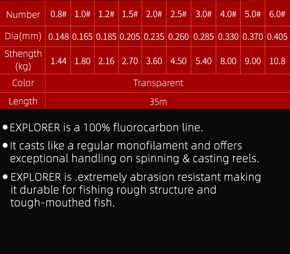 EXPLORER es una línea de fluorocarbono 100% que es prácticamente invisible en el agua y, por lo tanto, ideal para presentaciones sigilosas.