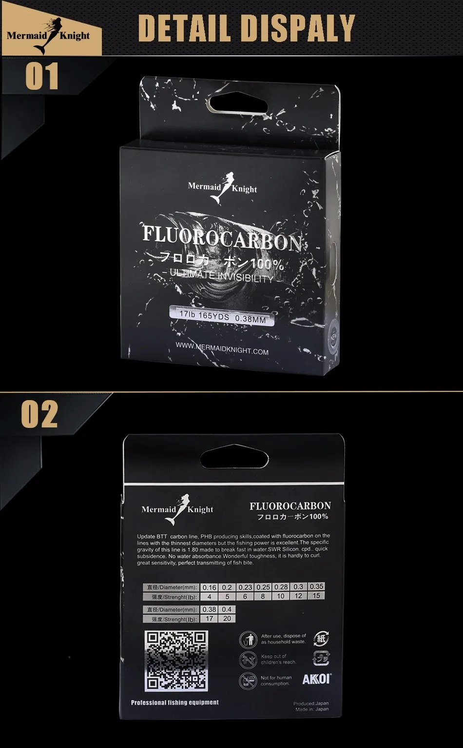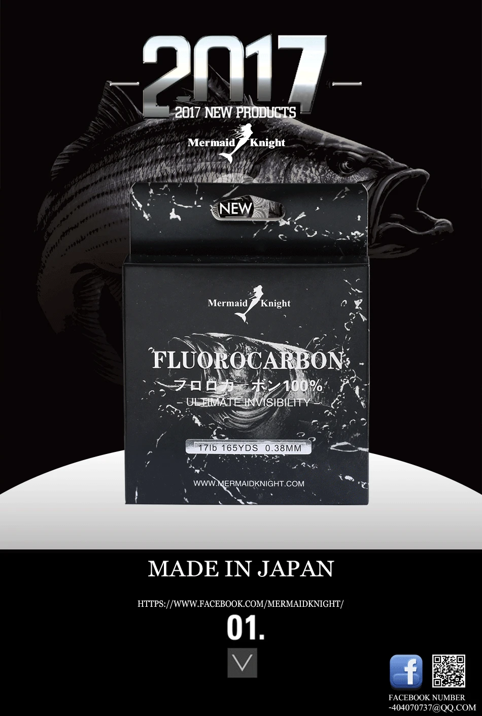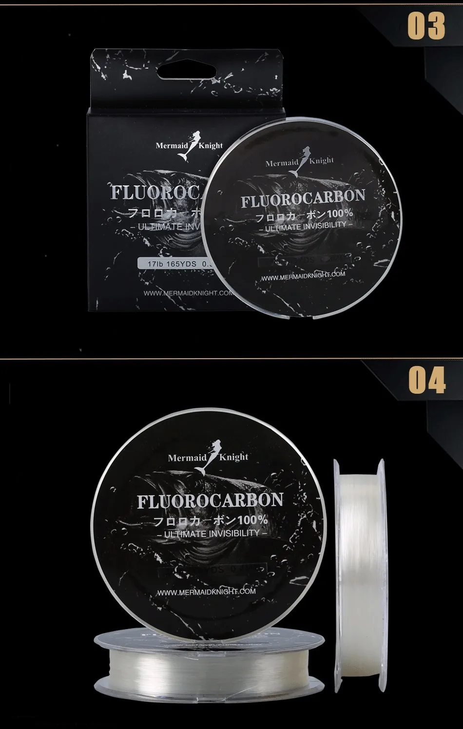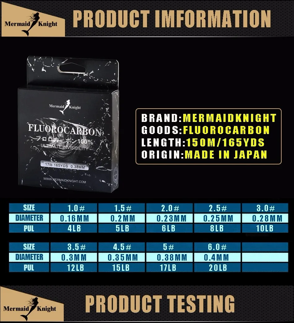 -MermaidKnight: La marca ganadora del Premio ICAST 2015, lanza la nueva línea de pesca de fluorocarbono 2016. Es una combinación de la línea de pesca de copolímero MermaidKnight número 1 en ventas con recubrimiento de fluorocarbono 100% de alta tecnología que reduce la visibilidad de la línea cuando se sumerge en el agua.