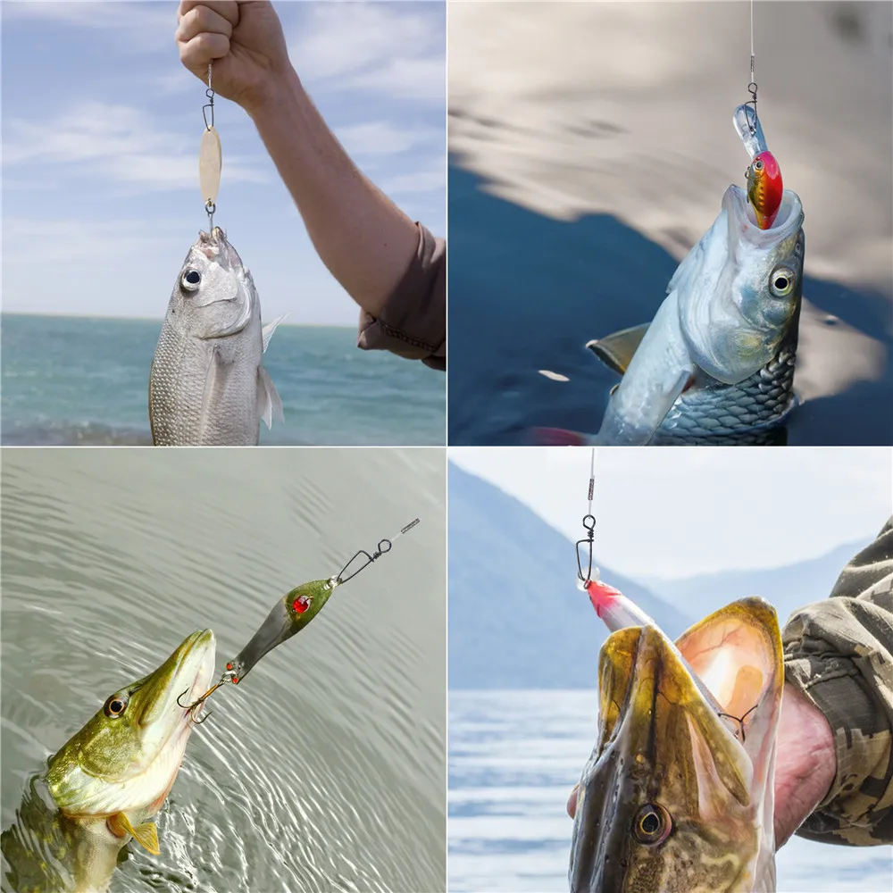 2.Los broches y los giratorios están hechos de acero inoxidable con gran dureza, no necesita preocuparse de que sus productos se oxiden después de su uso repetido.El broche puede cambiar rápidamente el cebo del señuelo y el giro girará en la dirección del movimiento del pez, lo que le facilitará la pesca y evitará que el pez se desenganche.