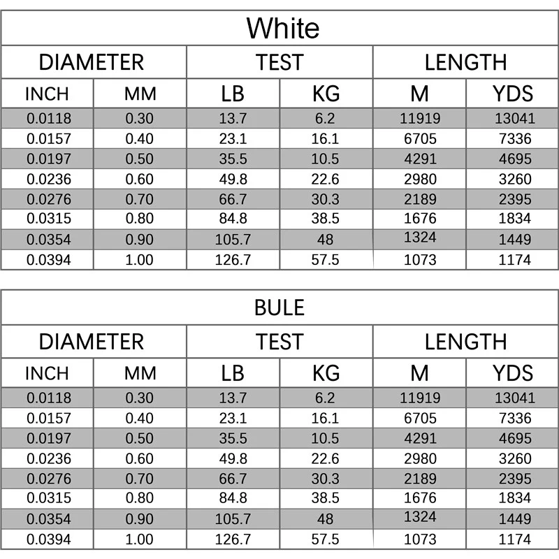 0,3mm/11919m/13.7lb, 0,4mm/6705m/23.1lb, 0,5mm/4291m/35.5lb, 0,6mm/2980m/49.8lb, 0,7mm/2189m/66.7lb, 0,8mm/1676m/84.8lb, 0,9mm/1324m/105.7lb, 1,0mm/1073m/126.7lb