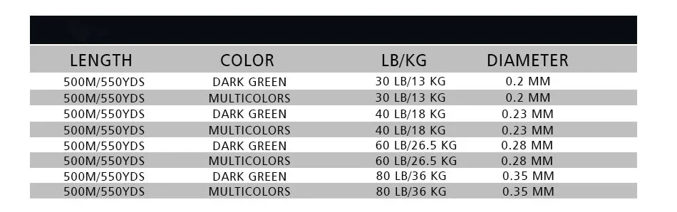 J-Braid está disponible en 3 opciones de colores; Chartreuse, verde oscuro y multicolor.La versión multicolor presenta 5 colores diferentes; Metido en incrementos de 10, 5 y 1 metro.