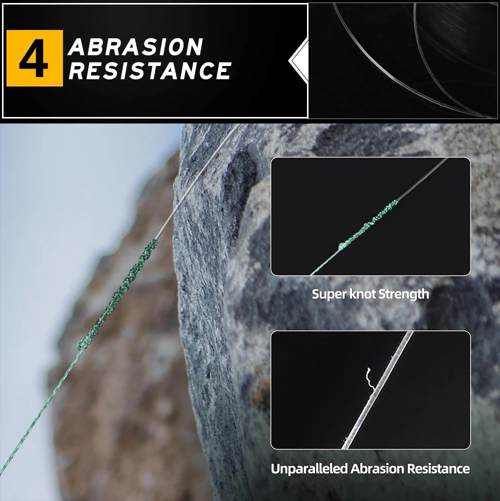 3. Atributo de especificaciones de alta resistencia: cubre un amplio rango de resistencia de 4-80 libras, satisfaciendo diferentes necesidades, desde pesca ligera hasta peleas de peces pesados.La alta resistencia a la tracción garantiza que la línea no sea fácil de romper cuando se trata de peces de gran tamaño o en entornos acuáticos complejos, brindando un excelente rendimiento de resistencia.