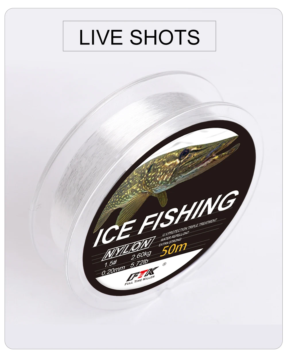 Línea de pesca de invierno FTK, línea de nailon súper fuerte, 50m, 3,72 LB-21,34 LB, resistencia a bajas temperaturas, línea de pesca en hielo transparente japonesa