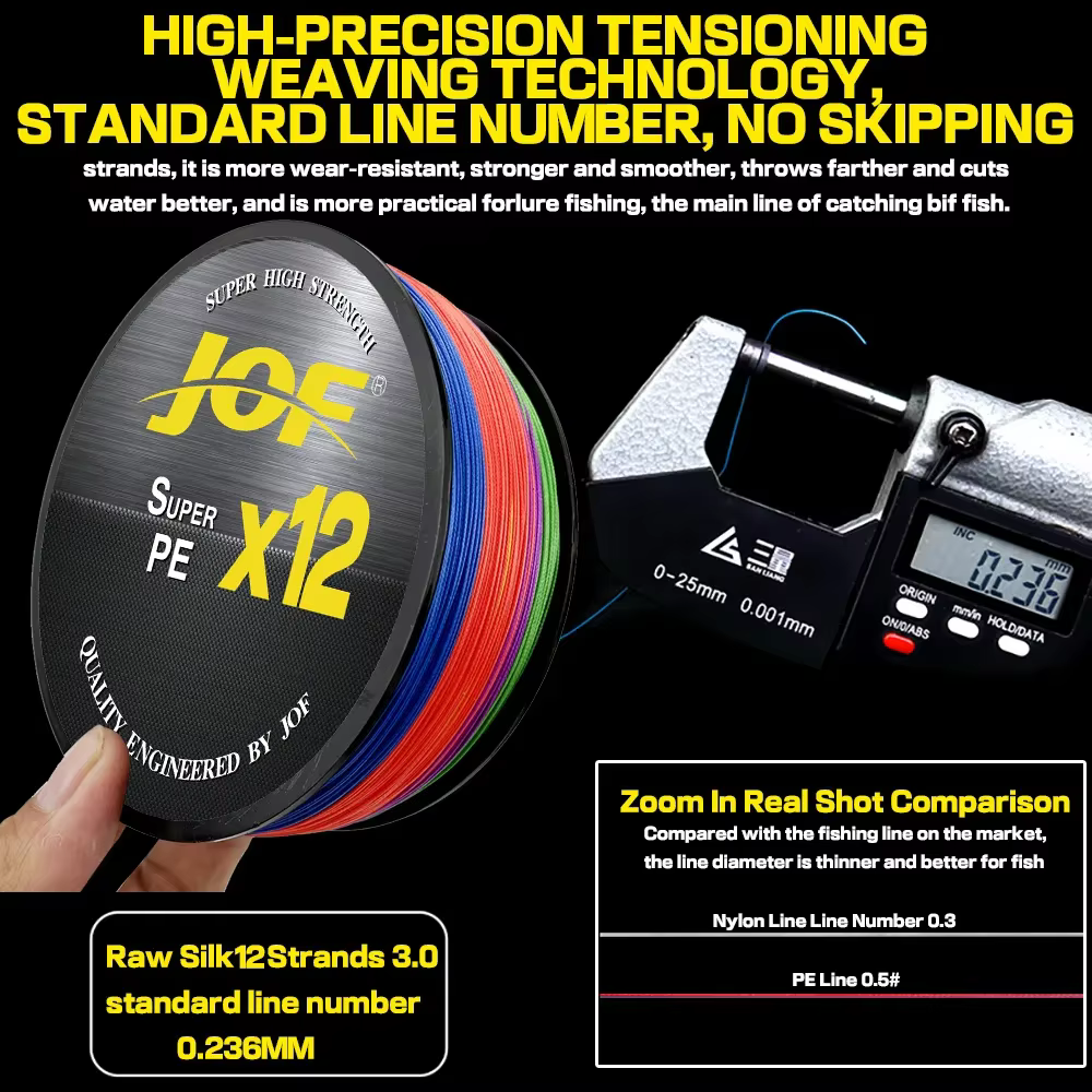 Hilo de pesca PE de 12 hebrasLa línea de pesca trenzada de 12 hebras es mucho más fuerte y duradera que las líneas de pesca tradicionales, por lo que es perfecta para la pesca en el mar y los peces grandes. Su tejido apretado garantiza que el cuerpo de la rosca sea más resistente a la tensión y a la resistencia a los explosivos, y dificulta su desconexión. La línea es adecuada para todo tipo de pesca de alta intensidad, lo que la hace perfecta para pescar en lugares con estructuras submarinas complicadas o demasiados obstáculos, como áreas de hierba pesada, lugares con muchas piedras, Y muchas ramas.