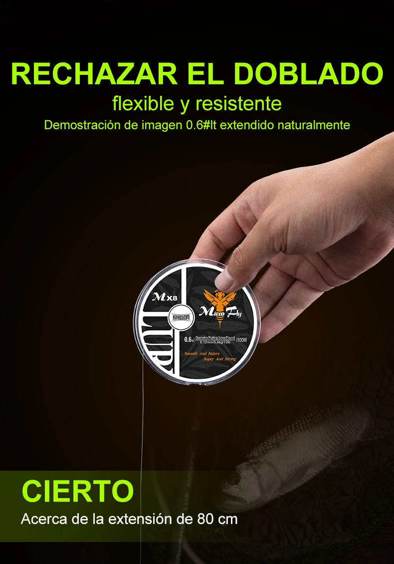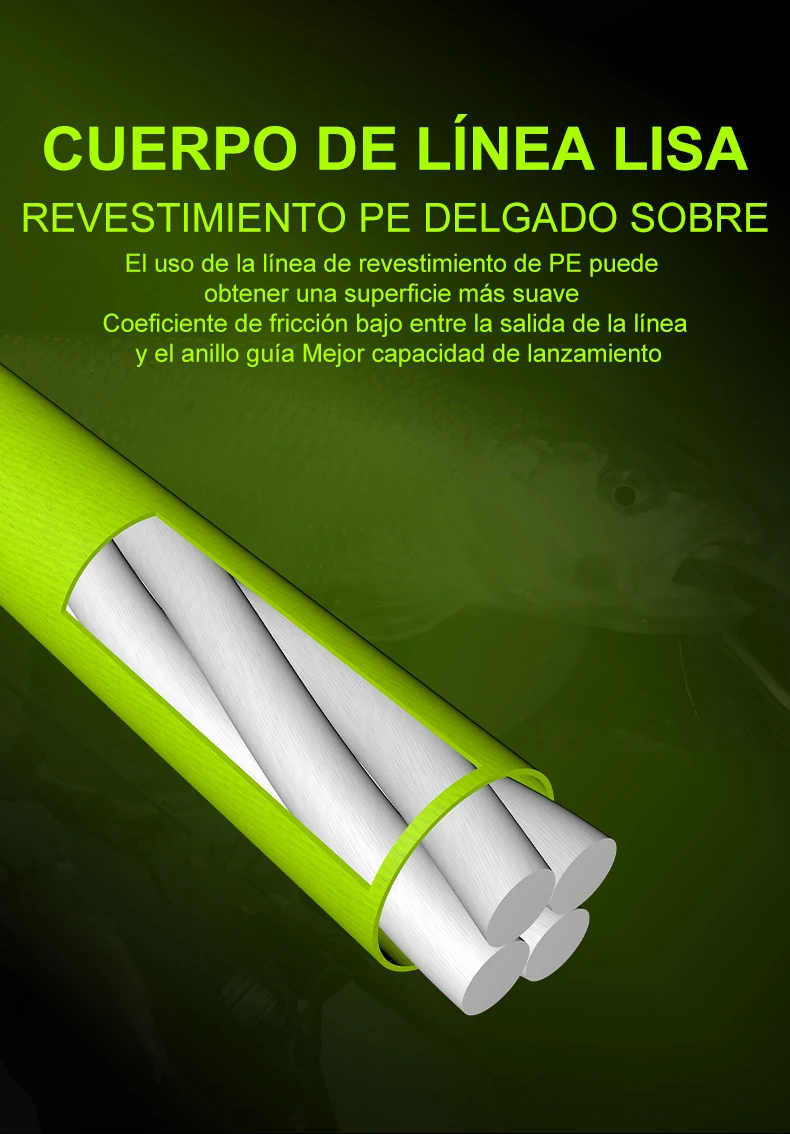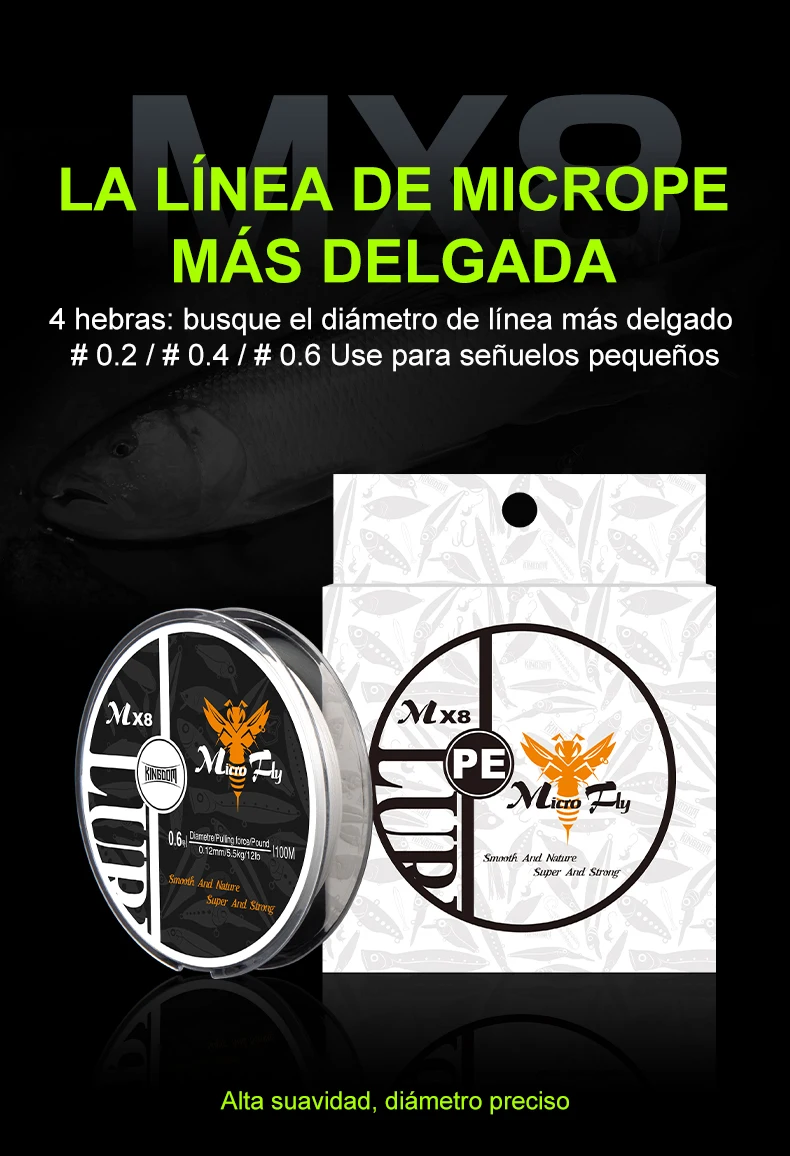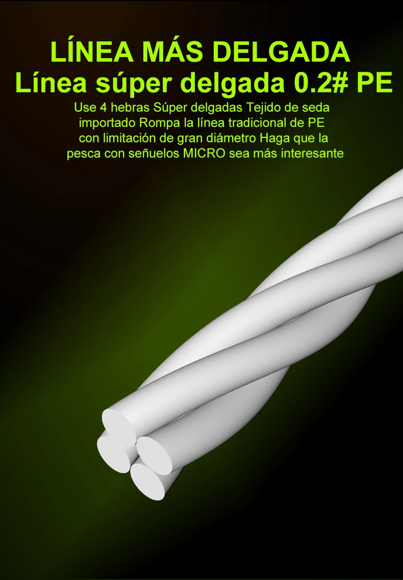 ● Usando 4 hebras de tejido de seda importado súper Delgado, romper la línea tradicional de PE con una limitación de diámetro grande hace que la pesca con micro señuelos sea más interesante.