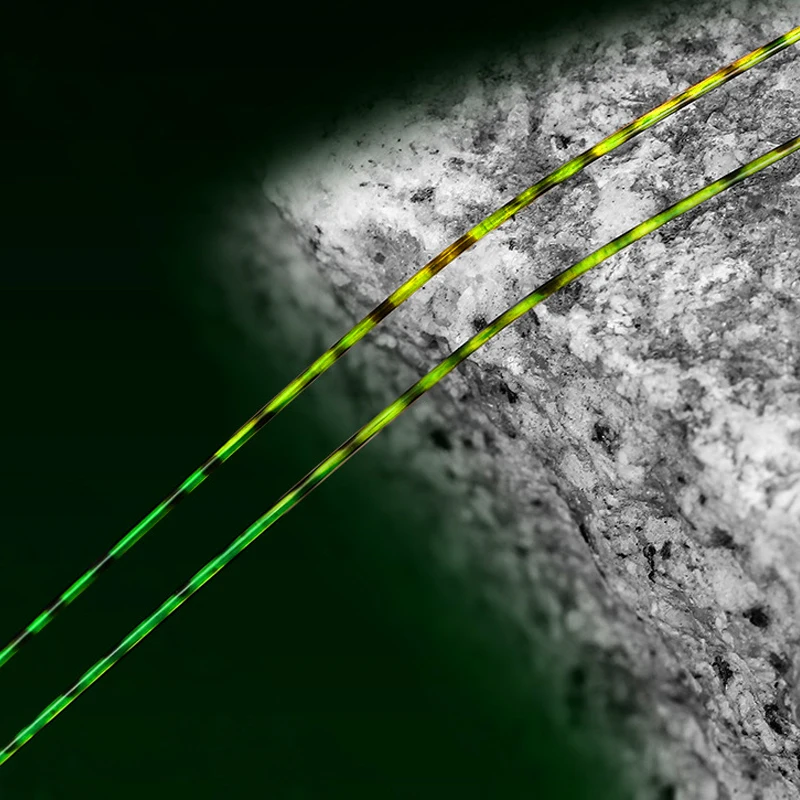 El fluorocarbono es el material menos visible cuando se sumerge en agua. La combinación de los dos materiales maximiza la ventaja de la invisibilidad del fluorocarbono con la baja memoria.