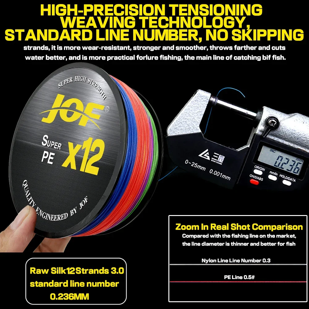 12 STRANDS PE FISHING LINEThe 12-strand braided fishing line is much stronger and more durable than traditional fishing lines, making it perfect for sea fishing and big fish. Its tight weave ensures that the thread body is better resistant to tension and explosive resistance, and making it hard to disconnect. The line is suitable for all kinds of high-intensity fishing, making it perfect for fishing in places with complicated underwater structures or too many obstacles, such as heavy grass areas, places with many stones, and many branches.