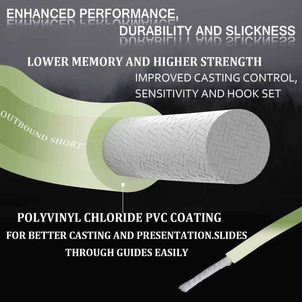 Recubrimiento de PVC con suavizante especial agregado para un rendimiento súper resbaladizo: la línea de mosca se desliza fácilmente a través de las guías de la caña y flota bien en agua tibia e incluso fría.El revestimiento liso dispara aún más la línea.