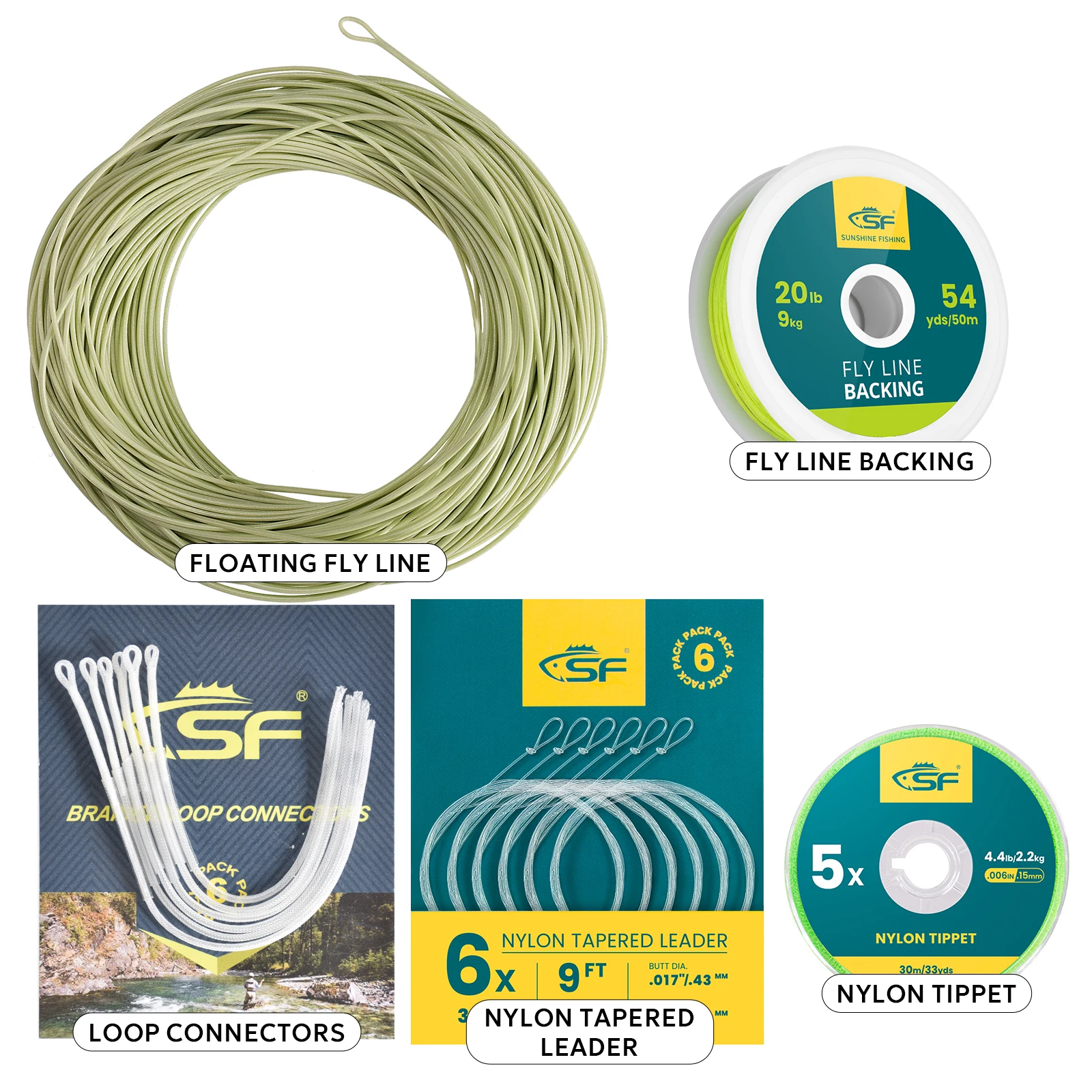 FL0714-8-K: 1 * línea de mosca verde musgo (WF8F, 100 pies) + 1 * línea de respaldo de color amarillo fluo (50 m, 30 lb) + 1 * líder cónico (9 pies, 1 x, 6 piezas) + 1 * línea de tippet de nailon (30 m, 0X) + 1 * conector de bucle blanco de nailon (50LB, 6 piezas)