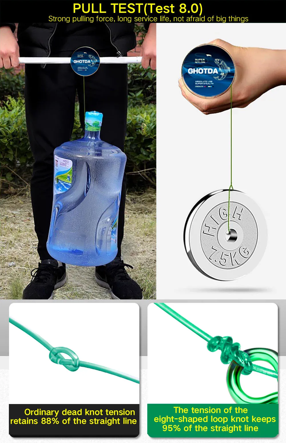 4 Hay un revestimiento especial en la superficie del hilo, que aumenta la densidad y resistencia del hilo de pescar, reduce la tensión superficial del agua, hace que el hilo de pescar sea menos probable que absorba agua y pueda ingresar al flujo de agua rápidamente y con baja fricción.