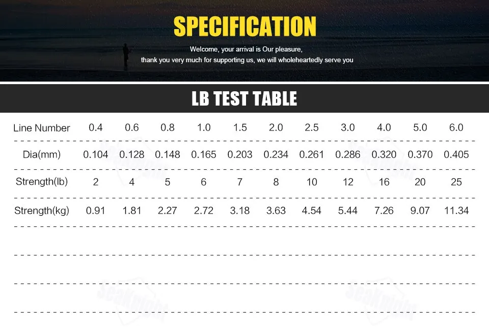 2 El número de línea no es el diámetro ni la resistencia en LB, consulte la tabla de tallas cuidadosamente antes del pago y déjenos un mensaje si hay algo confundido, ¡gracias!