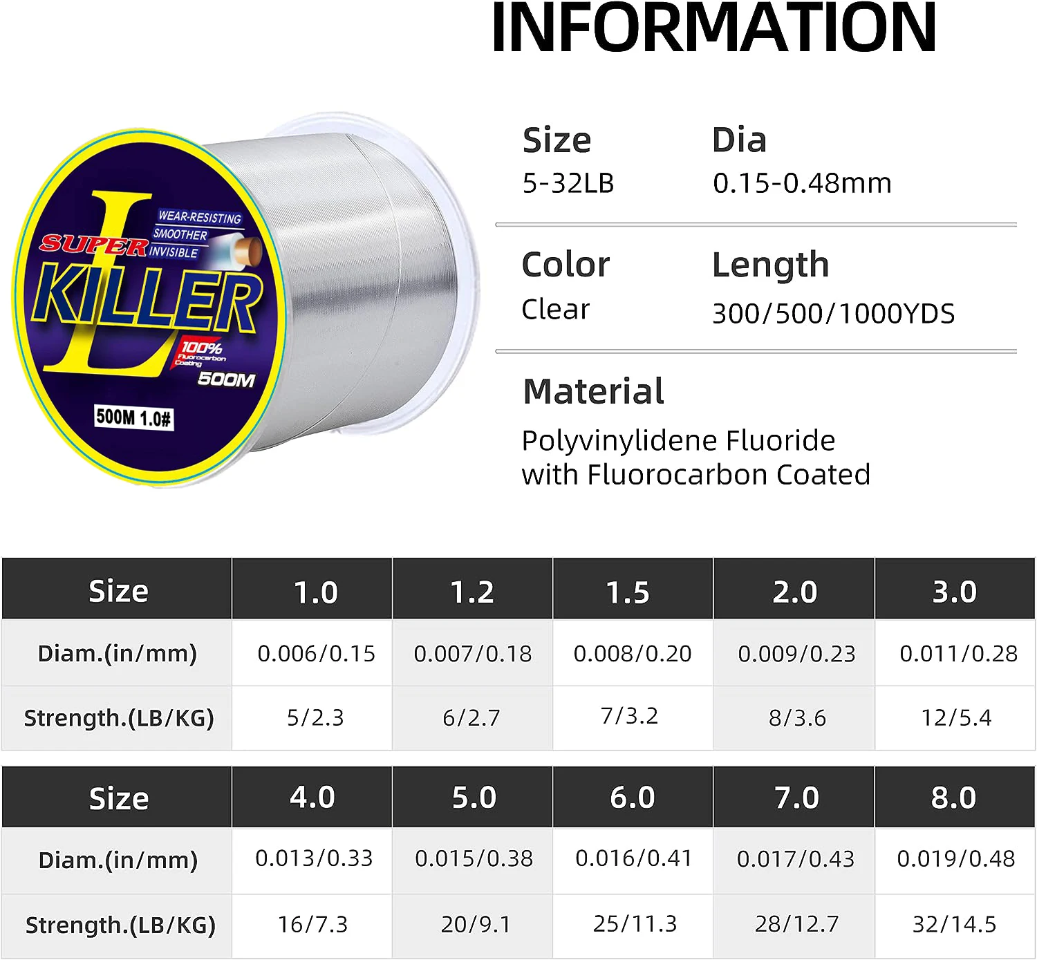 [Prácticamente invisible] El índice de refracción de la luz del fluorocarbono es casi idéntico al agua, lo que hace que la línea sea prácticamente invisible para los peces en el agua para una presentación sigilosa, que podría usarse en cualquier condición del agua