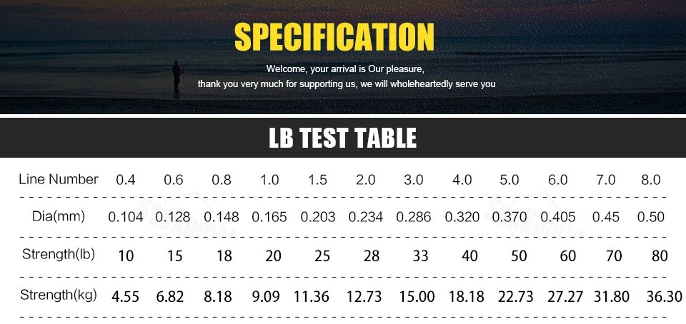 Debido a que 1000M es fácil de dañar durante el transporte, para reducir los productos dañados, todos aquellos que compran 1000M son enviados por dos 500M, y aquellos que se preocupan no deben comprarlo Características: 1, 2 colores disponibles. Línea de PE de 2, 4 hebras, construcción trenzada única, hecha de fibras de PE de resistencia ultraalta. 3. Recubrimiento especial de la superficie, más suave que nunca. 4. Fuerza y dureza excepcionales, más duraderas, difíciles de tirar. 5. Manejo superior y diámetro más delgado para cortar agua fácilmente. 6. Memoria extremadamente baja. 7, Material de calidad que asegura una línea trenzada colorfast. Detalles del producto: Modelo: línea de pesca trenzada serie TriPoseidon Metros: 100M 500M 1000M(500M + 500M) Forma: nivel Material: alambre trenzado Flotabilidad: línea flotante Tejidos: 4 hebras Adecuado: agua salada/agua dulce Parámetro básico: Número de línea 0,4 #: 0,10mm / 10LB/4,5 KG Número de Línea 0,6 #: 0,12mm / 15LB/6,8 KG Número de línea 0,8 #: 0,14mm / 18LB/8,2 KG Número de línea 1,0 #: 0,16mm / 20LB/9,1 KG Número de línea 1,5 #: 0,20mm / 25LB/11,3 KG Número de línea 2,0 #: 0,23mm / 30LB/13,6 KG Número de línea 3,0 #: 0,28mm / 35LB/15,9 KG Número de línea 4,0 #: 0,32mm / 40LB/18,1 KG Número de línea 5,0 #: 0,37mm / 50LB/22,7 KG Número de línea 6,0 #: 0,40mm / 60LB/27,2 KG Número de línea 7,0 #: 0,45mm / 70LB/31,8 KG Número de línea 8,0 #: 0,50mm / 80LB/36,3 KG Lista de paquetes: 1 hilo de pescar Nota: El número de línea no es el diámetro, revise la tabla cuidadosamente y déjenos un mensaje si hay algo confuso, gracias
