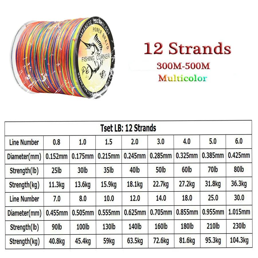 Línea trenzada de 12 hebras, 300m/500m/1000m, multifilamento, 25-230LB, multicolor, súper fuerte, línea de PE japonesa, pesca en agua salada