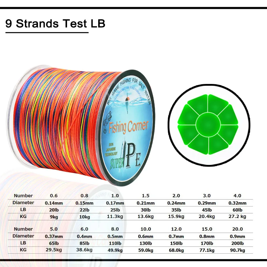 Línea de pesca multifilamento para agua salada, 9 hebras, hilo de pescar de PE trenzado, 300M/500M/1000M/1500M, Multicolor, 20LB-200LB