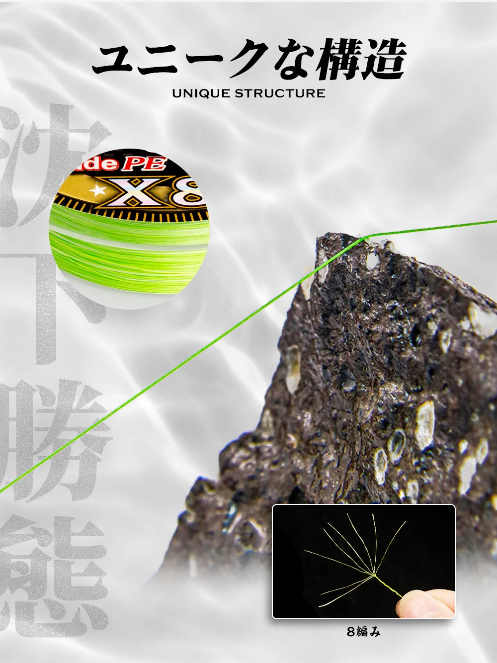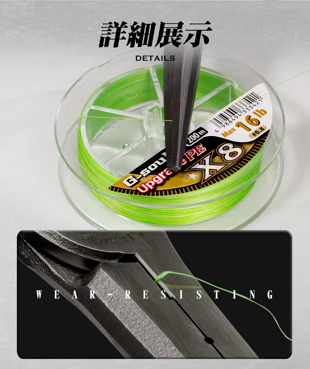 La tecnología confiable permite¡La calidad de hilo YGK más fuerte del mundo en comparación con el mismo diámetro de hilo!Una línea de PE de alta calidad que cumple con los "Estándares para el espesor del hilo de PE" establecidos por el subcommitido de las líneas de pesca de la Asociación de la Industria de los productos de pesca de Japón. El número es la unidad de Japón. Si utiliza la notación "0,8", debería ser un hilo estándar japonés de 0,8. La actualización es una unidad principal WX8 que utiliza nuestra propia tecnología, el método de montaje WX, basado en este estándar japonés. Además, al darle a la línea una firmeza y firmeza exquisitas al aplicar el procesamiento GP, la operatividad y la resistencia a la abrasión mejoran enormemente y se logra una alta resistencia. Se coloca un marcador de byte de 15 cm cada 1 m para que sea más fácil capturar Atari en la lubina nocturna y en las caídas de egi.