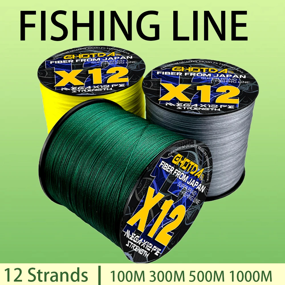Línea de pesca trenzada de PE, 300M/500M/1000M/100M, 12 hebras, 12 tejidos, cuerda fuerte, pez marino, 25-120LBS, amarillo, verde, Multicolor, gris